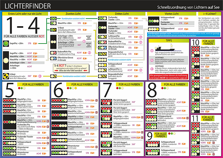 Gerade bei Nachtfahrten in verkehrsreichen Gebieten ist es oftmals schwierig, ein Wasserfahrzeug anhand seiner Lichter zu identifizieren. Diese Info-Tafel ermöglicht es Ihnen in wenigen Schritten, alle Fahrzeuge, die Ihnen auf See begegnen, zuzuordnen. Eine Anleitung und zusätzliche Tipps erleichtern die Nutzung der 2-seitigen Info-Tafel, so dass das Bestimmen von Fahrzeugen anhand ihrer Lichter zum Kinderspiel wird. Selbstverständlich eignet sich die Info-Tafel auch zur Prüfungsvorbereitung oder zur Vorbereitung auf einen Törn bzw. zum Wiedereinstieg nach längerer Pause. Durch die wasserfeste Laminierung kann die Tafel an Bord genutzt werden und hält auch widrigsten Bedingungen stand.