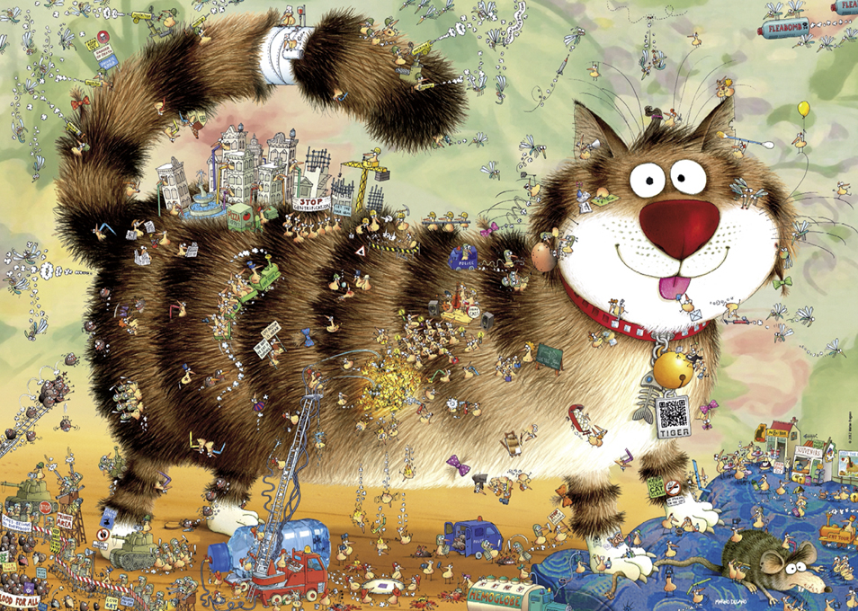 Nun sind Marino Deganos flinke Flöhe auch noch auf diese allerliebste Katze übergesiedelt. Sie trägt's derweil mit Fassung und lässt sich gut gelaunt zusammenpuzzeln.