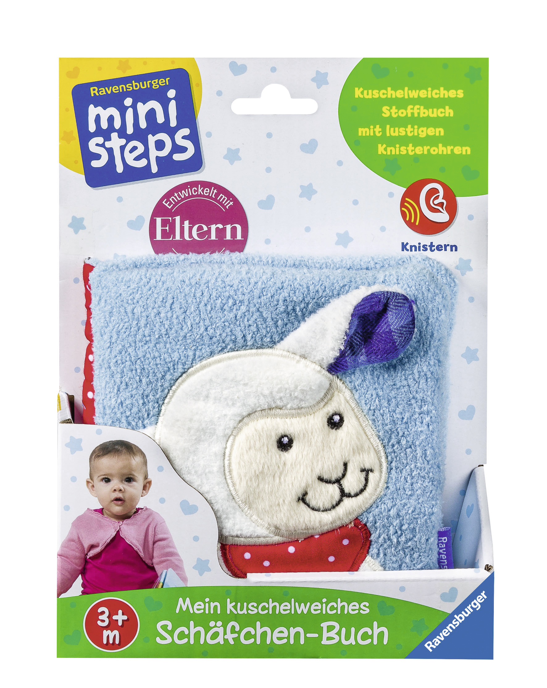 Das Schäfchen auf dem kuscheligen Cover spielt die Hauptrolle in dem weichen Stoffbuch für Babys. Es lädt die Kleinen zur Entdeckungsreise auf die Wiese ein. Dort begegnen sie dem Schweinchen, einer Blume, einem bunten Käfer, einem Traktor und dem stolzen Hahn. Was Babys besonders gefällt: Die Ohren des Schäfchens knistern, wenn sie sie berühren.