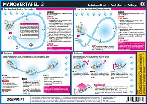Auf der beidseitig bedruckten, laminierten Info-Tafel 'Manövertafel 3' werden fortgeschrittene Fahrtmanöver mit der Segeljolle beschrieben. Zu den Manövern zählen das Boje-über-Bord-Manöver, Beidrehen, Beiliegen, das Fahren eines Aufschießers, Achterausssegeln, und Schwojen. Neben den durchzuführenden Aktionen werden auch die Kommandos und entsprechenden Rückmeldungen genau erklärt. In gut nachvollziehbaren Schritt-für-Schritt-Anleitungen werden die einzelnen Manöver sowohl für Anfänger, als auch für Wiedereinsteiger leicht verständlich dargestellt. Durch die wasserfeste Laminierung kann die robuste Info-Tafel auch an Bord mitgenommen und jederzeit im Alltag eingesetzt werden.