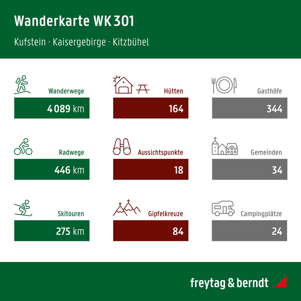 freytag & berndt Wanderkarten sind dank der detaillierten digitalen Kartographie und der genauen Maßstäbe ideale Begleiter beim Wandern, Bergsteigen und auf Skitouren. Sie werden regelmäßig überarbeitet und enthalten aktualisierte Informationen zu Wanderwegen, Rad- und Mountainbikestrecken, Hütten, Naturdenkmälern, kulturellen Sehenswürdigkeiten und Freizeiteinrichtungen. Das beiliegende Informationsheft enthält eine Auswahl der besten Wanderwege, Radwege und Mountainbikestrecken sowie eine kurze Beschreibung der einzelnen Gemeinden mit ihrem Freizeitangebot. (Sprache: Deutsch) Freizeitinformationen, Wander- und Weitwanderwege, Mountainbike- und Radtouren, Ortsregister mit Postleitzahlen, GPS-tauglich, Klettersteig, Reitweg, Schiroute, Langlaufroute, Nordic-Walking-Strecke; Region: Kufstein, Kitzbühel, Kaisergebirge, Tiroler Unterland, Tirol; Besondere Wander-Themenwege: Nordalpeweg, Via Alpina, Adlerweg, Jakobsweg, Höhenrundweg Hohe Salve, Hüttentour am Wilden Kaiser, Pillersee und Teufelskamm, Taubensee, Schwarzsee und Gieringer Weiher; Spezielle Rad- und Mountainbiketouren: Inn-Radweg, Mozart-Radweg, BikeTail Tirol, Harschbichl; Umgebungskarten: WK 121, WK 321, WK 382, WK 393, WK D9;