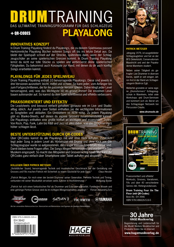 Patrick Metzger, Jahrgang 1979, ist ausgebildeter Schlagzeuglehrer und hat einen Bachelor of Arts in „Popmusik-Design“ an der Popakademie Mannheim gemacht. Neben seiner Tätigkeit als gefragter Live- und Studio-Drummer, leitet er die Schlagzeugschule „Drumsformers“. Zudem ist er fester Workshop-Autor bei dem Schlagzeugmagazin Sticks und aktiv bei Percussion Creativ e.V. Seine Schlagzeugausbildung absolvierte er u.a. bei Dom Famularo, Prof. Udo Dahmen, David Garibaldi, Claus Hessler, Benny Greb und Jost Nickel. Kollegen über Patrick Metzger: „Vorbildlicher Sound, hervorragende Technik und musikalischer Geschmack bei der Gestaltung von Grooves und Fills machen Patrick mit Sicherheit zu einem Glücksfall für jede Band." (Claus Hessler) „Patrick Metzger, für mich einer der besten Drummer seiner Generation. Perfekte Technik und Timing, verbunden mit seiner Musikalität versetzen seine Zuhörer in Hochstimmung...“ (Wolfgang Basler) „Patrick hat sich einen fantastischen Ruf als Drummer und Educator erarbeitet. Fundiertes Wissen und eine gehörige Portion Groove sind da im richtigen Mengenverhältnis angelegt.“ (Florian Alexandru-Zorn)