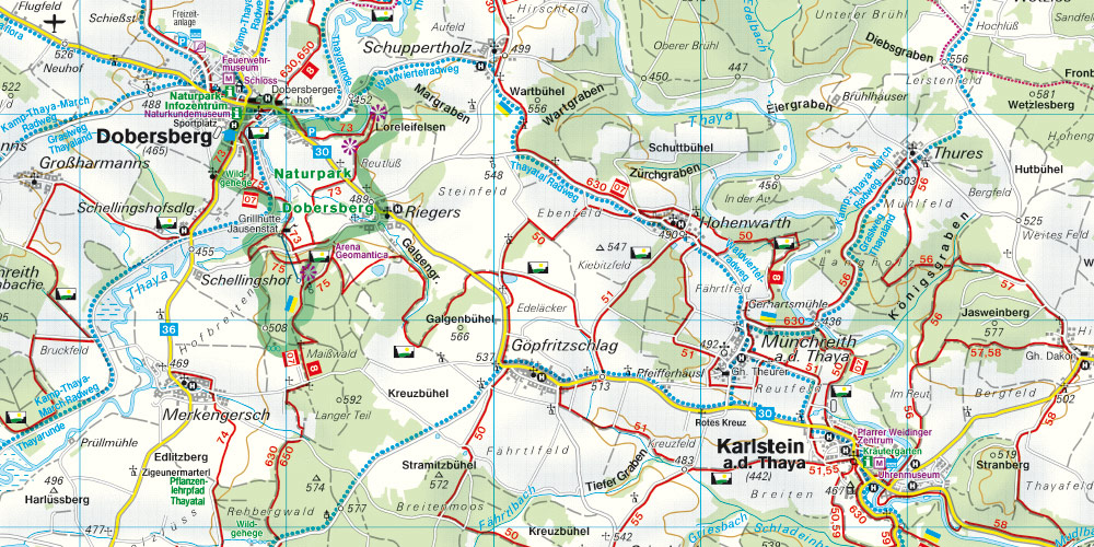 Niederösterreichischer Landesrundwanderweg, Grasel Wege, Der Weg entlang der Lainsitz, Kuenringerweg, Robert-Hamerling-Weg, Thayatalweg, Thaya-Kamp-Weg, Thaya-Taffa-Wild-Rundweg, Christopherusweg, Walther von der Vogelweide-Marathon, Nordwaldkammweg, Wanderung Naturpark Dobersberg, Bandlkramer-Rundwanderweg;