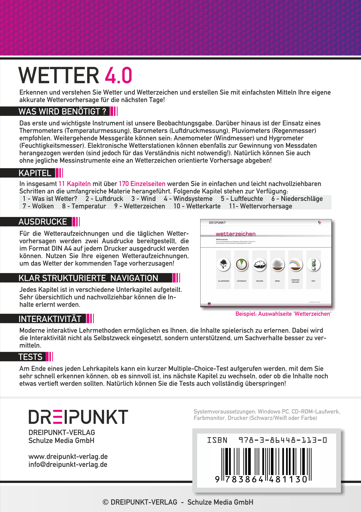 | Schlagworte | Dreipunkt • Dreipunkt Verlag • Dreipunkt-Verlag • Hochdruckgebiet • Klima • Lernsoftware • Meteorologie • PC-Lernsoftware • Prognose • Regen • Software • Tiefdruckgebiet • Wetter • Wetter erklären • Wetterkunde • Wetterphänomen • Wetterprognose • Wetter verstehen • Wetter vorhersagen • Windsysteme • Wolken |
