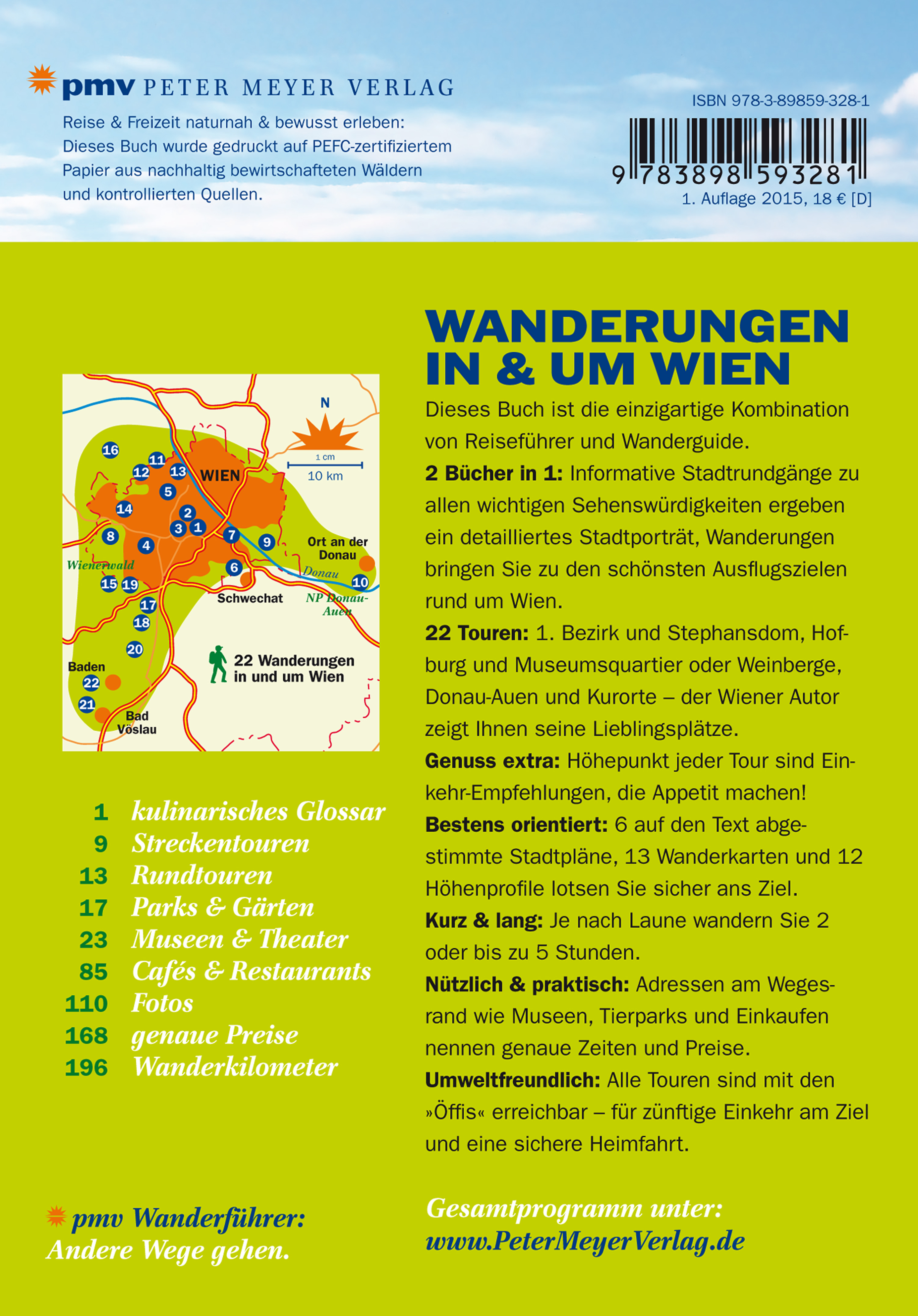 'Wanderungen in & um Wien' – das neue Buch aus dem Peter Meyer Verlag ist Wander- und Reiseführer in einem. Franz Wille führt seine Leser auf 6 Spaziergängen durch die Millionenstadt und auf 16 Wanderungen ins Umland. Er führt durch Wien und zeigt, dass der Prater mehr ist als nur Vergnügungspark. Spanische Hofreitschule, Beethoven- und Mozart-Wohnung oder die Kaisergemächer von Franz und Sisi werden geschichtenreich vorgestellt. Den Ring entlang geht es kulturell gespickt zum Museumsquartier, kulinarisch angereichert über den Naschmarkt oder in einen der Schanigärten. In der grünen Umgebung werden Donau-Auen und Wienerwald erwandert, über Weinberge geht es auf die Hausberge mit einmaligen Ausblicken auf die Stadt. Großzügige Fotos zeigen die Schönheit der Natur und machen Lust auf die Touren. Das Beste kommt dabei zum Schluss: Zu jeder Wanderung gibt es die besondere Einkehrempfehlung des Wiener Autors, die schon beim Lesen Appetit macht: Wiener Melange und Sachertorte im Kaffeehaus oder Schnitzel und Tafelspitz im Gasthaus. Zum Heurigen führt er dorthin, wo 'ausg‘steckt is'. Mit 2 – 5 Stunden sind alle Touren für spontane Ausflügler oder Kurzbesucher geeignet. Die genauen Wanderkarten, Höhenprofile sowie Tipps für An- und Rückreise mit öffentlichen Verkehrsmitteln sind ideal zum sofortigen Aufbrechen.