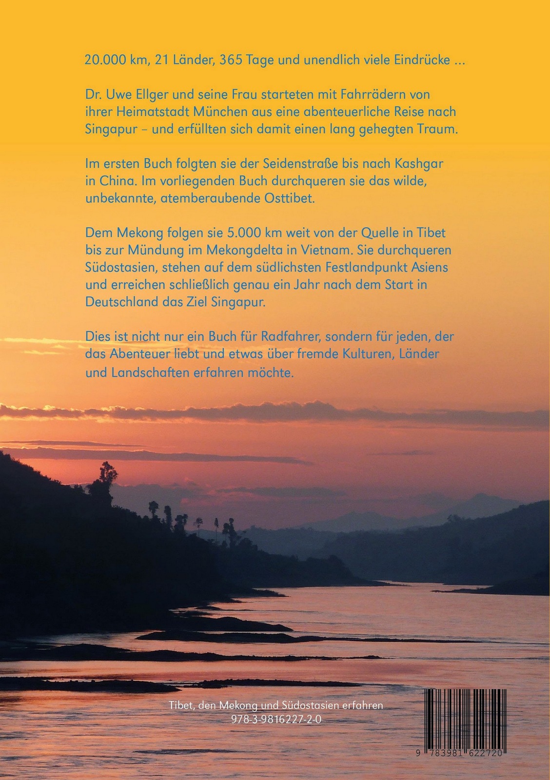 Ein Jahr lang radelten die beiden Münchener Ärzte Dr. Isabel Ritz und Dr. Uwe Ellger von München nach Singapur. Während dieser abenteuerlichen 26.000 km langen Fahrt fuhren sie selber 20.000 km auf ihren Rädern durch 21 Länder. Im ersten Buch- Die Seidenstraße erfahren- berichtet Uwe Ellger über die Fahrt auf der Seidenstraße auf den Spuren Marco Polos von München aus bis nach Kashgar in China. Im vorliegenden Band führt sie ihre Reise von Xining in Qinghai/ Osttibet/ China über das Tibetische Plateau durch die Provinzen Sichuan und Yunnan. Dem Schicksalsfluss Asiens, dem Mekong, folgen sie mehr als 5.000 km weit. Von der auf mehr als 5.000 m Höhe gelegenen Quelle in Tibet bis zu seiner Mündung ins Südchinesische Meer im Mekongdelta in Vietnam. Von dort aus durchqueren die beiden Abenteurer ganz Südostasien, stehen am südlichsten (Festlands-) Punkt Asiens und erreichen nach genau einem Jahr ihre finale Destination Singapur. Der Leser erfährt Vieles, auch über die wenig bekannten Regionen und Völker entlang ihrer Route. Er nimmt teil an den Abenteuern und Erfahrungen und spürt die Liebe und Anteilnahme, die die beiden Protagonisten ihrer bevorzugten Art des Reisens entgegenbringen und den vielen Menschen und Kulturen, die sie auf der langen Reise kennenlernen durften. Das Buch richtet sich nicht nur an Radnomaden, sondern an jeden der das Abenteuer liebt und mehr über fremde Kulturen und unbekannte Gebiete erfahren möchte. 272 Seiten; 700 Bilder.