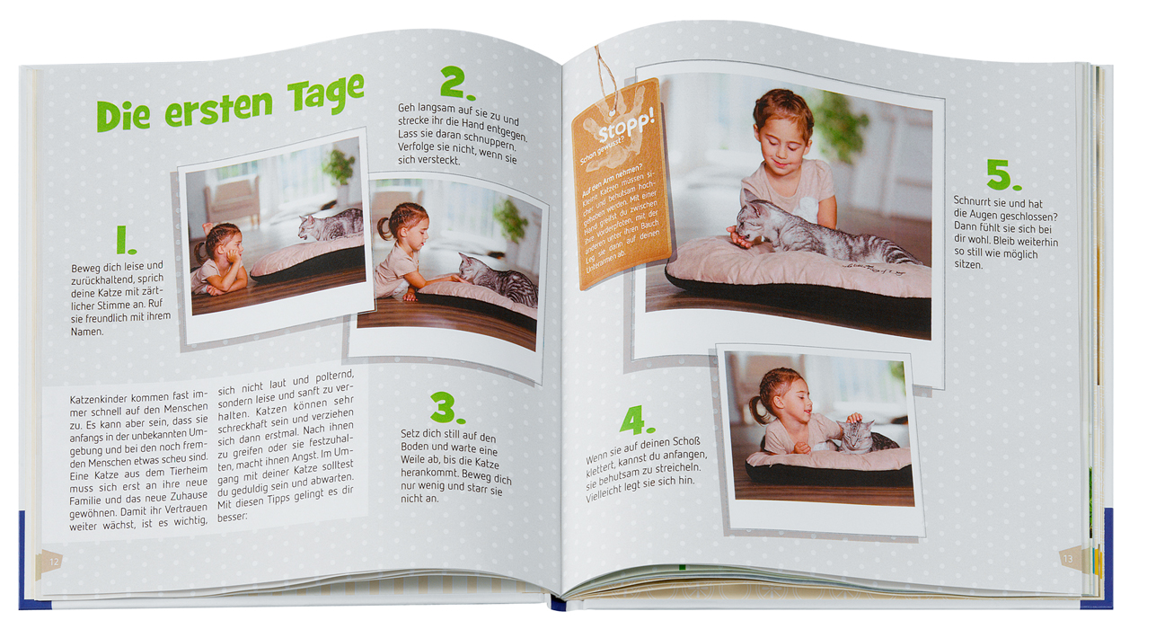 Samtpfote oder Straßentiger in diesem Buch kann das Kind alles über seine Katze verewigen. So entsteht ein einmaliges Album über das geliebte Haustier. Und gleichzeitig lernt das Kind, was nötig ist, um seine Katze richtig zu versorgen.