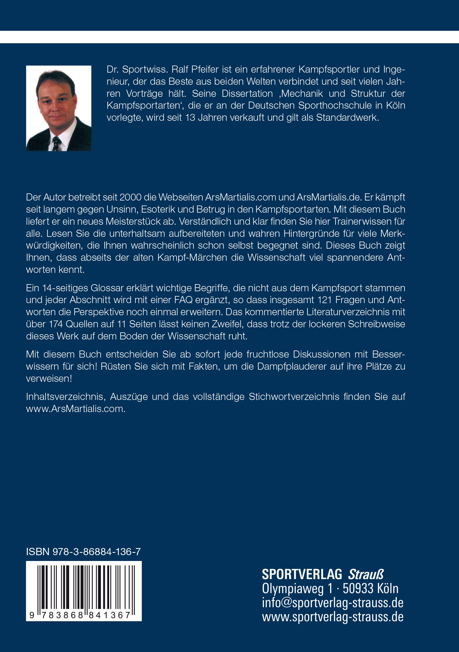 Dr. Sportwiss. Ralf Pfeifer ist ein erfahrener Kampfsportler und Ingenieur, der das Beste aus beiden Welten verbindet und seit vielen Jahren Vorträge hält. Seine Dissertation ‘Mechanik und Struktur der Kampfsportarten’, die er an der Deutschen Sporthochschule in Köln vorlegte, wird seit 13 Jahren verkauft und gilt als Standardwerk. Inhaltsverzeichnis, Auszüge und das vollständige Stichwortverzeichnis finden Sie auf www.ArsMartialis.com.