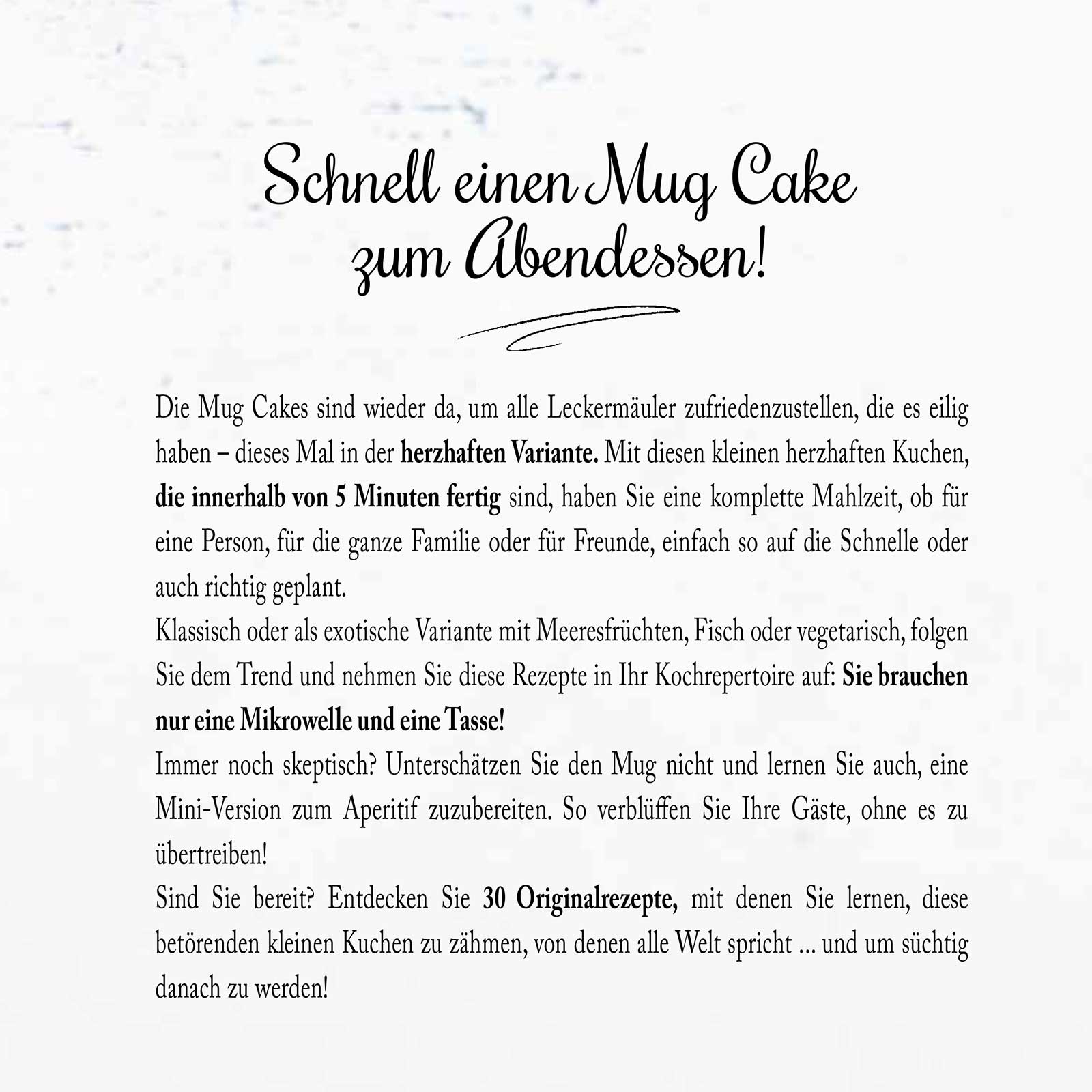 Die süße Variante hat die Herzen der Hobbybäckerinnen im Sturm erobert. Aber manchmal ist die Lust auf Herzhaftes mindestens genauso groß. 30 Rezepte, mit rohem Schinken, Tapenade, Krabben, Roquefort oder Chorizo minutenschnell zubereitet: Eine Tasse, eine Mikrowelle - guten Appetit!