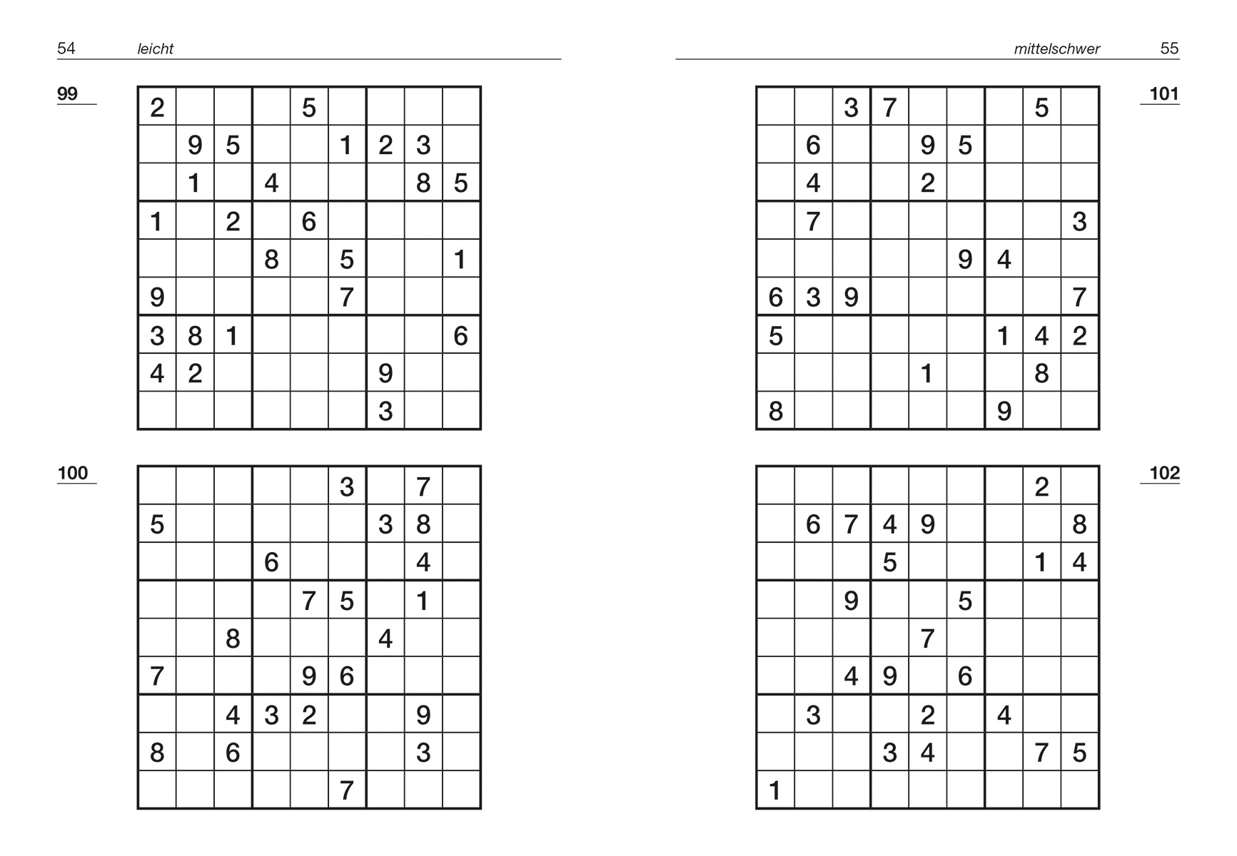 Das aus Japan kommende Rätsel Sudoku besteht aus neun quadratischen 3 x 3-Blöcken, wobei jeder quadratische Block in drei Reihen mit jeweils drei Kästchen unterteilt ist. In jedem quadratischen 3 x 3-Block sind Zahlen zwischen 1 und 9 vorgegeben. Diese vorgegebenen Zahlen gilt es so zu ergänzen, dass jede Zahl zwischen 1 und 9 nur einmal vorkommt. Auch in den neun Spalten und neun Zeilen des gesamten Sudoku-Rätsels dürfen die Zahlen von 1 bis 9 nur einmal vorkommen. Die Sudoku-Rätsel sind in die Schwierigkeitsstufen sehr leicht, leicht, mittelschwer, schwer und sehr schwer eingeteilt.