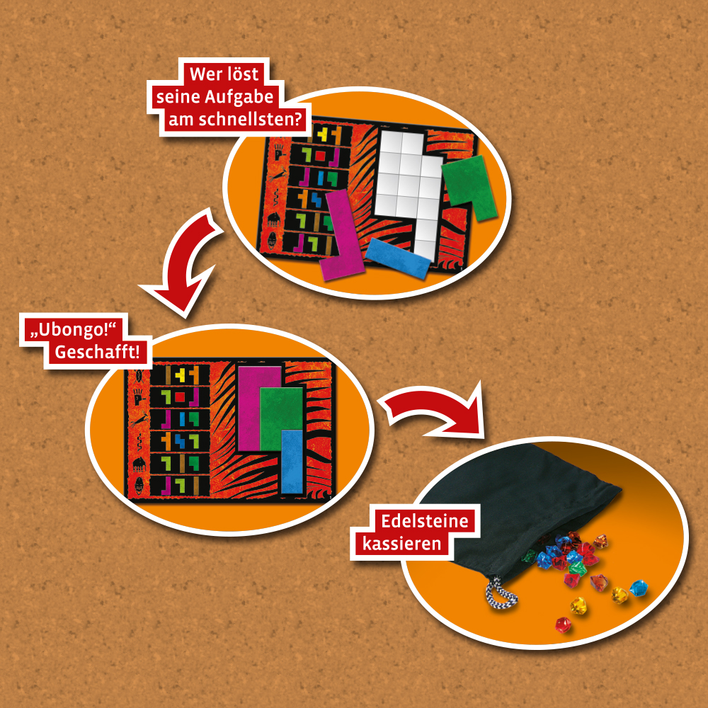 gt; Bei Ubongo lautet die Devise: Schnell aufgebaut. Schnell losgespielt! > Lege auf Zeit, rufe "Ubongo!" und gewinne Edelsteine. > Ubongo ist für jeden was ab 8 Jahren: Für verschiedene Generationen mit unterschiedlichen Fähigkeiten, die durch die zwei Schwierigkeitsstufen mit jeder Menge Spaß zusammenspielen können. > Fördert spielerisch logisches Denkvermögen. > Brettspiel für die ganze Familie, zu zweit oder allein: Für 1-4 Spieler. > Mit optionaler kostenloser KOSMOS Erklär-App. Mit und ohne App spielbar. Jeder Spieler hat eine Legetafel und 12 Legeteile vor sich. Es wird gewürfelt und die Sanduhr umgedreht. Alle versuchen, ihre Tafel so schnell wie möglich mit den angegebenen Teilen zu belegen. Wer dies schafft, ruft "Ubongo!" und wird mit Edelsteinen belohnt. Sieger wird, wer am Ende die wertvollsten Edelsteine gesammelt hat. Und das ist nicht unbedingt der Schnellste! Das Spiel macht so viel Spaß, dass auch nach Ablauf der Sanduhr erfolglose Spieler mit Hilfe der Mitspieler weiter tüfteln, bis sie ihre Tafel gelöst haben. Die Regeln sind so einfach, dass sofort losgespielt werden kann. Auch bei Ubongo gilt das KOSMOS-Prinzip: Mit und ohne App der volle Spielspaß! Per optionaler KOSMOS Erklär-App können sich die Spieler die Regeln erklären lassen. Und falls jemand mal bei einer Aufgabe nicht weiterkommt, bietet die App eine Lösungshilfe. Dank des "lebendigen Timers", der die Sanduhr ersetzt, bekommen die Spieler automatisch mit, wenn die Zeit zum Legen vorbei ist. Außerdem können zwei Zeiten eingestellt werden, damit zum Beispiel Erwachsene weniger Zeit zur Verfügung haben als mitspielende Kinder. Für 1 - 4 Spieler ab 8 Jahren. Spieldauer: ca. 25 Minuten.