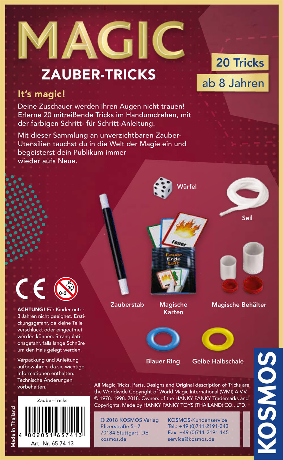 gt; It's magic: Der perfekte Einstieg in die faszinierende Welt der Magie > Ideale Grundausstattung für kleine Zauberkünstler: Spannende Zauberutensilien für 20 Tricks und Illusionen > Spielerisch Zaubern lernen: Fördert Geschicklichkeit , Feinmotorik und Selbstbewusstsein der kleinen Zauberer > Zaubern lernen im Handumdrehen: Mit farbiger Schritt für Schritt-Anleitung für die perfekte Vorführung > Ein ideales Geschenk für interessierte Kinder und neugierige Erwachsene. Ab 8 Jahren geeignet. Der kleinste KOSMOS-Zauberkasten bietet einen einfachen Einstieg in die faszinierende Welt des Zauberns. Kinder können sich mit Hilfe der farbigen Anleitung eine tolle Zaubershow zurechtlegen und vor Publikum vorführen. Der Kasten bietet eine Grundausstattung, mit der Kinder ihr Publikum garantiert verblüffen werden. Ab 8 Jahren.