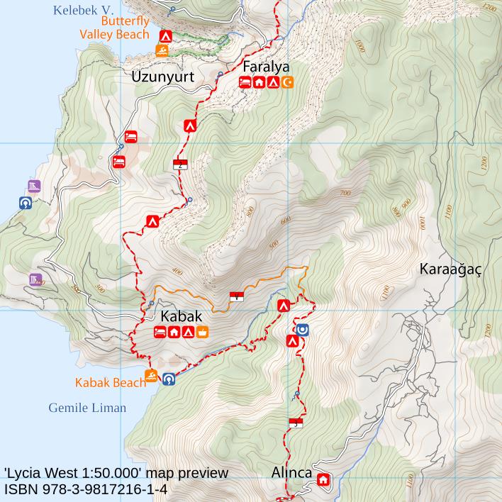 Die "Lycia West Hiking Map" besteht aus 2 topographischen Wanderkarten im Maßstab 1:50.000. Sie decken den gesamten Westen und Süd-Westen der Lykischen Küste ab. Neben allen wichtigen topographischen Inhalten enthalten die Karten u. A. wichtige Wanderwege, Sehenswürdigkeiten, Wasserentnahmestellen, Zelt- und Biwak-Plätze sowie den exakten Wegverlauf mit allen Varianten des Lykischen Weges von Fethiye bis Demre.