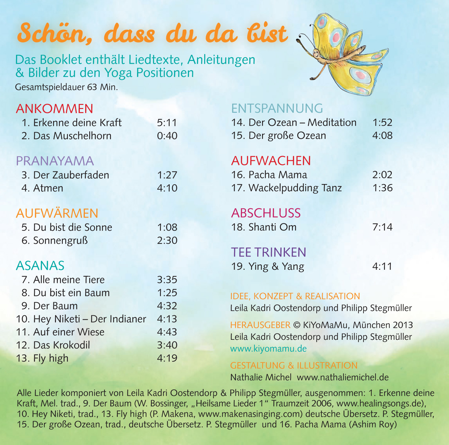 Die erste Kinderyoga-Übungs-CD im deutschprachigen Raum: Das Hörbuch "Schön dass du da bist", erschienen im KiYoMaMu Verlag, vereint musikalisch untermalte und gesungene Anleitungen und gesprochene Meditationen zu einer 1-stündigen Hatha-Yoga Sequenz für die ganze Familie! Jede Yogaposition wird in dem beiliegenden 40-seitigem Booklet zusätzlich erklärt. Laufzeit insgesamt 63 Minuten.