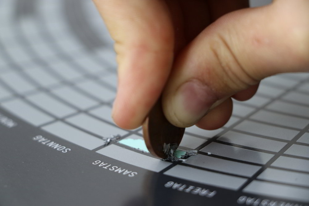 Ein einzigartiger Wandkalender für aktive Läufer. Für jeden Tag, an dem man gelaufen ist, lässt sich ein Feld frei rubbeln. So entsteht über das Jahr ein einzigartiges Muster. Dieser Kalender ist eine große Motivationshilfe für Laufanfänger und eine visuelle Unterstützung für aktive Sportler. Im oberen Teil des Wandkalenders befinden sich 365 mit Rubbellack überzogene Kästchen, für jeden Tag des Jahres eines. Diese Kästchen sind entsprechend der Wochentage und Monate angeordnet. Jedes Kästchen kann frei gerubbelt werden. Im unteren Teil des Wandkalenders befindet sich ein Kalendarium mit Terminen für Läufer. Die wichtigsten Marathonveranstaltungen so wie einige Halbmarathon Veranstaltungen werden angezeigt.