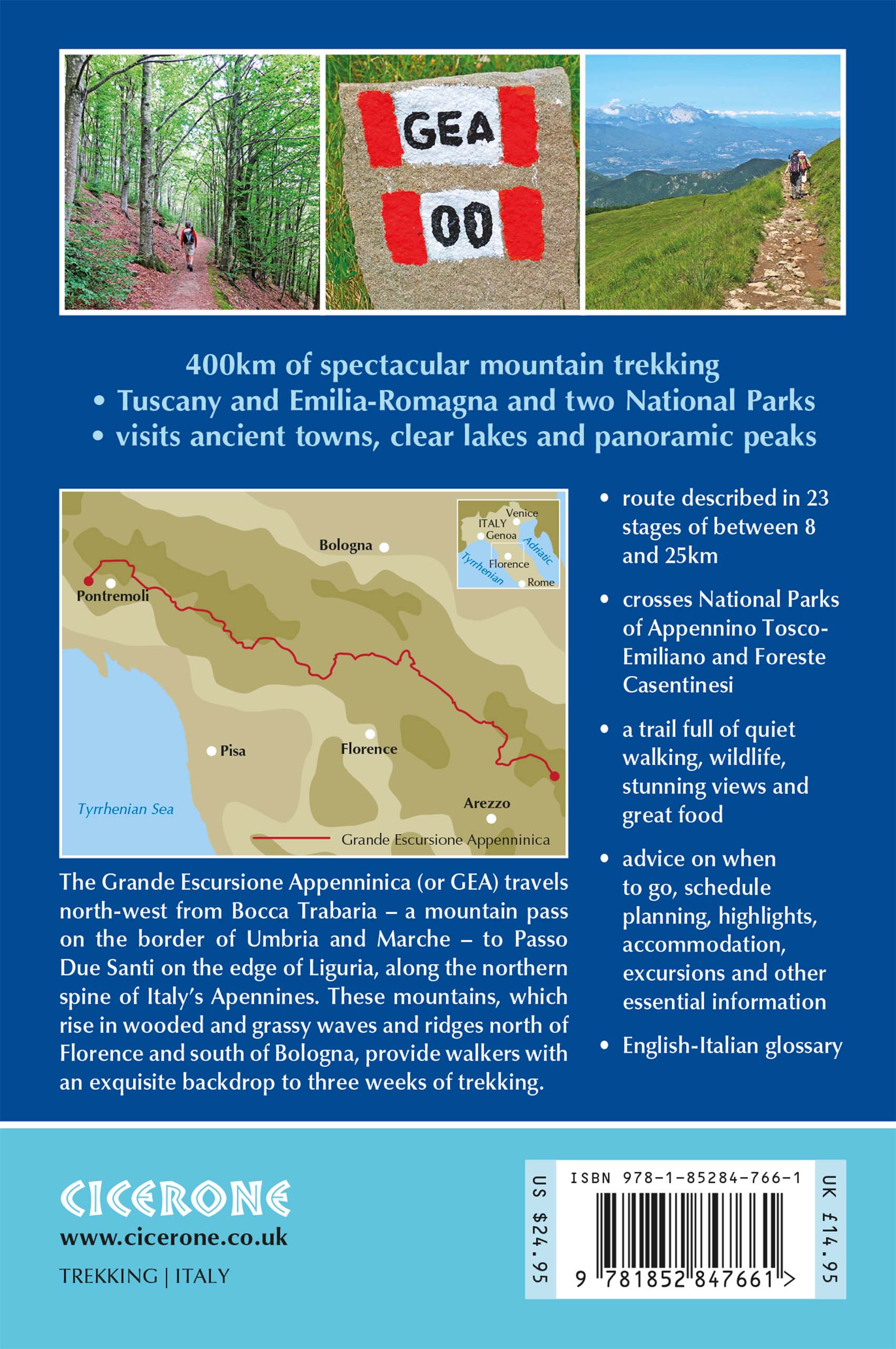 A guidebook to trekking the Grande Escursione Appenninica (GEA), a 400km waymarked trail through Italy’s Appenine mountains. Extending from Bocca Trabaria to Passo Due Santi through the regions of Tuscany and Emilia-Romagna, the route is straightforward and suitable for a broad range of trekkers, with walking on paths, forestry tracks and quiet lanes.