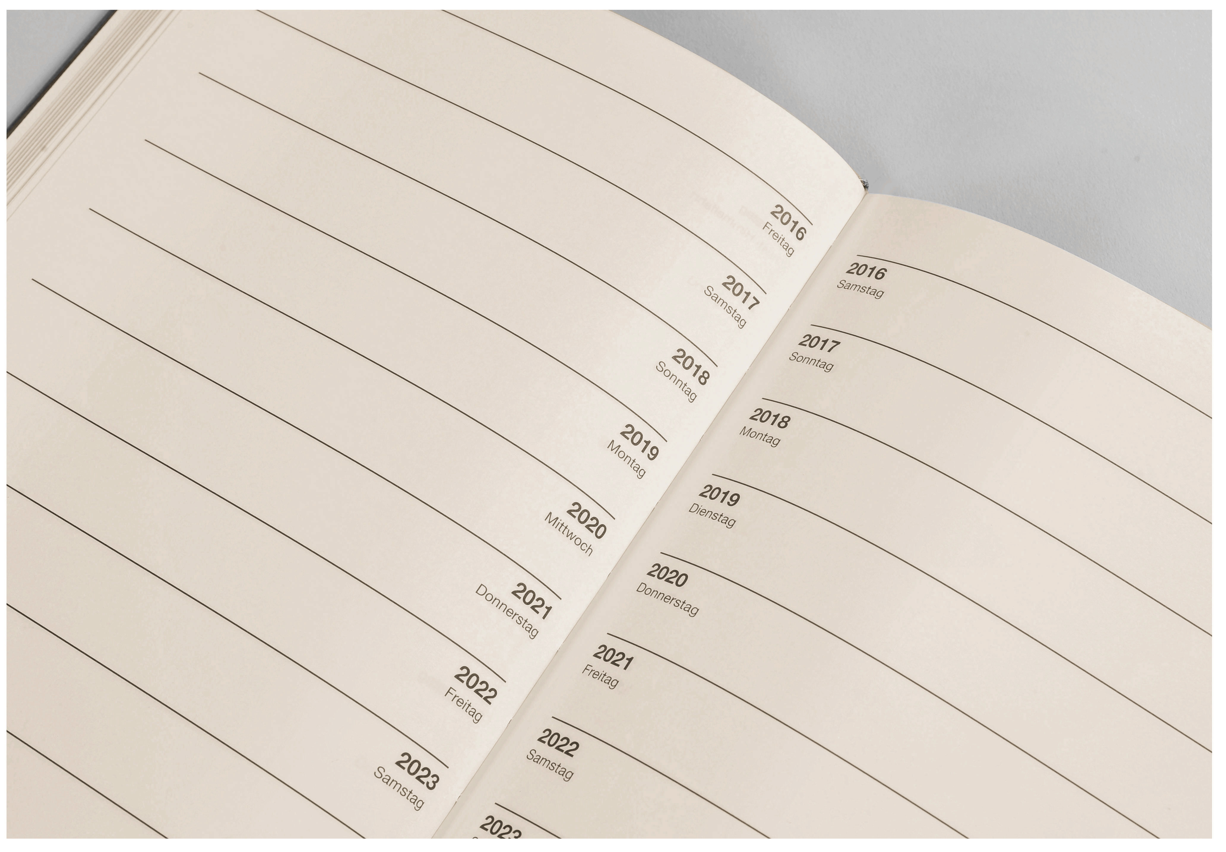 Gefertigt in einer Buchbinde-Manufaktur wird der Jahresweiser mit abgerundeten Ecken, zwei Zeichenbändern und Goldschnitt geliefert.