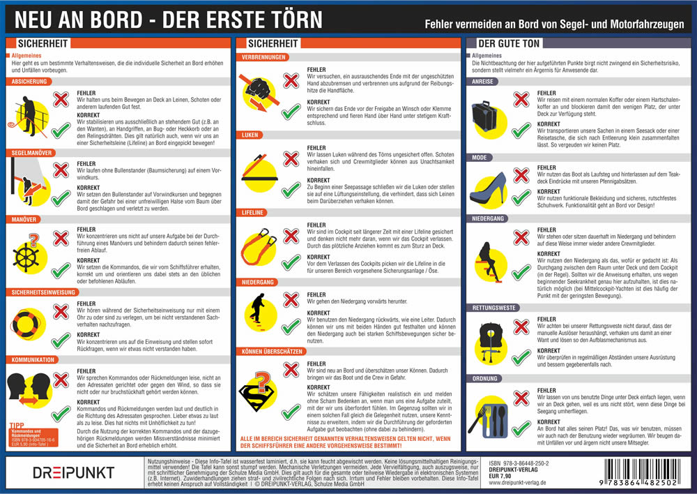 Es gibt Kleinigkeiten, die die Atmosphäre an Bord vergiften, ohne dass sich der Verursacher einer Schuld bewusst ist. Abläufe, die logisch erscheinen, werden an Bord vielleicht ganz anders als erwartet ausgeführt. Jeder, der das erste Mal zu einem Törn aufbricht, muss eine Menge 'Praxis' erlernen. Mit dieser Info-Tafel können die wichtigsten Fehler bereits ausgeschlossen werden! Der Törn lässt sich leichter genießen, wenn man die Fehlerquellen eliminiert hat. Durch ihre wasserfeste Laminierung kann die zweiseitige Info-Tafel auch an Bord mitgenommen werden und über viele Jahre hinweg verwendet werden.