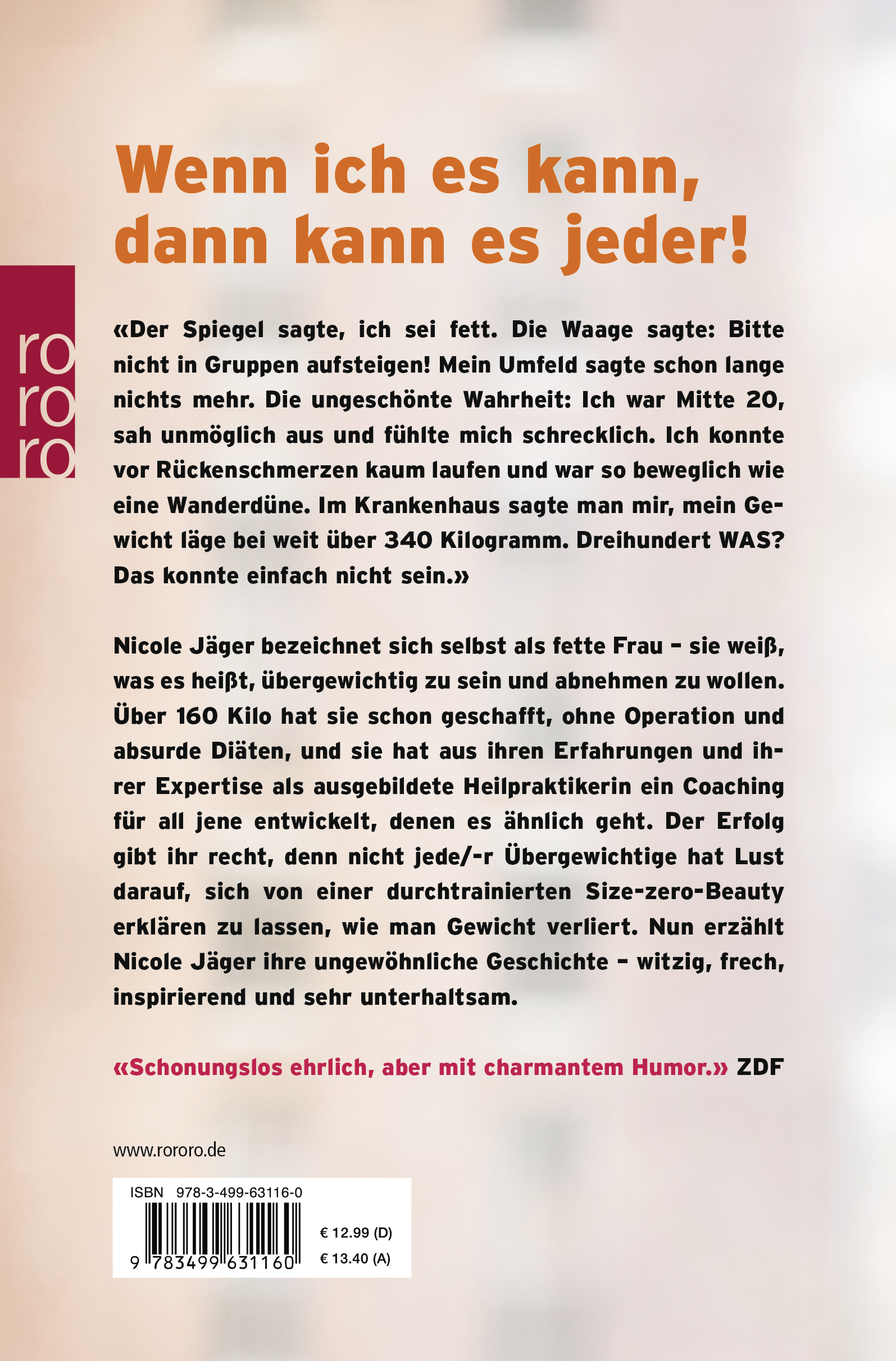Nicole Jäger bezeichnet sich selbst als fette Frau - sie weiß, was es heißt, übergewichtig zu sein und abnehmen zu wollen. Über 160 Kilo hat sie schon geschafft, ohne Operation und absurde Diäten, und sie hat aus ihren Erfahrungen und ihrer Expertise als ausgebildete Heilpraktikerin ein Coaching für all jene entwickelt, denen es ähnlich geht. Der Erfolg gibt ihr Recht, denn nicht jede/r Übergewichtige hat Lust darauf, sich von einer durchtrainierten Size-Zero-Beauty erklären zu lassen, wie man Gewicht verliert. Nun erzählt Nicole Jäger ihre ungewöhnliche Geschichte - witzig, frech, inspirierend und sehr unterhaltsam.