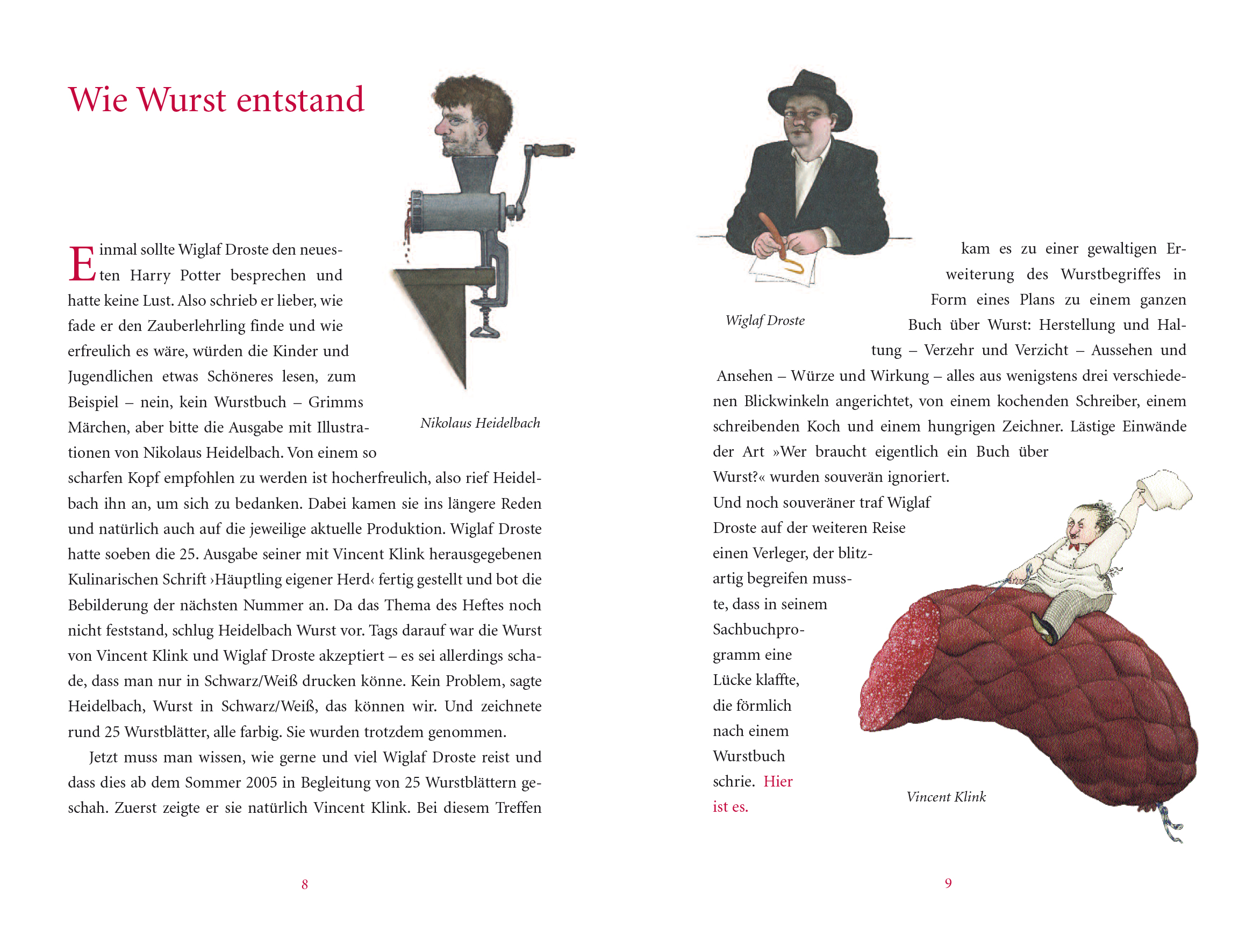 Starkoch Vincent Klink erinnert sich an blutige, aber beseelte Schlachttage und gibt außergewöhnliche Wurstrezepte, Illustrator Nikolaus Heidelbach richtet mit seinen kulinarischen Stillleben die Kalte Platte aufs Liebevollste an und Wiglaf Droste, der »Tom Waits der satirischen Schnappschüsse« (Galore), schlägt nicht nur den Bogen von der Currywurst zur Wurst als Lustobjekt – er scheut sich nicht, die ganze Welt zur Wurst zu erklären.