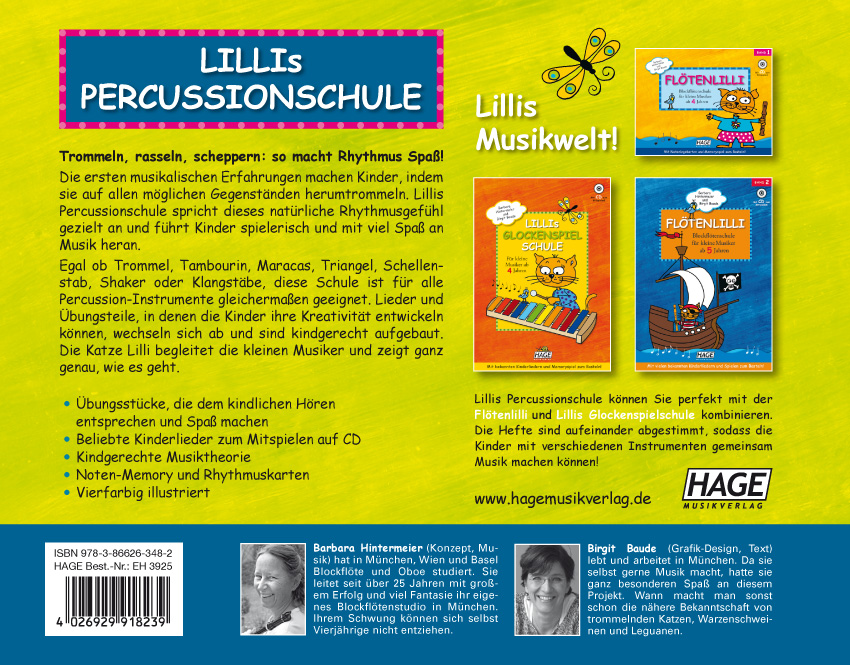Egal ob Trommel, Tambourin, Maracas, Triangel, Schellenstab, Shaker oder Klangstäbe, diese Schule ist für alle Percussion-Instrumente gleichermaßen geeignet. Lieder und Übungsteile, in denen die Kinder ihre Kreativität entwickeln können, wechseln sich ab und sind kindgerecht aufgebaut. Die Katze Lilli begleitet die kleinen Musiker und zeigt ganz genau, wie es geht.