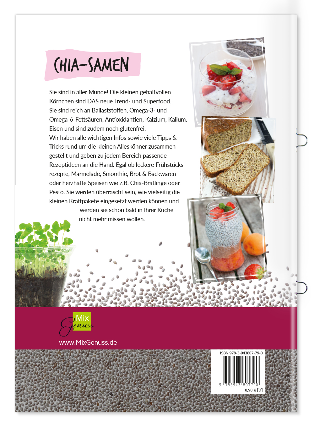 Chia-SamenSie sind in aller Munde! Die kleinen gehaltvollen Körnchen sind DAS neue Trend- und Superfood.Sie sind reich an Ballaststoffen, Omega-3- und Omega-6-Fettsäuren, Antioxidantien, Kalzium, Kalium, Eisen und sind zudem noch glutenfrei. Wir haben alle wichtigen Infos sowie viele Tipps & Tricks rund um die kleinen Alleskönner zusammengestellt und geben zu jedem Bereich passende Rezeptideen an die Hand. Egal ob leckere Frühstücksrezepte, Marmelade, Smoothie, Brot & Backwaren oder herzhafte Speisen wie z.B. Chia-Bratlinge oder Pesto. Sie werden überrascht sein, wie vielseitig die kleinen Kraftpakete eingesetzt werden können und werden sie schon bald in Ihrer Küche nicht mehr missen wollen.