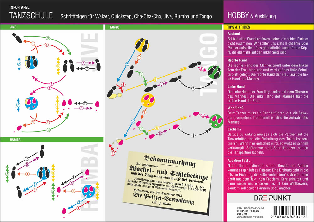 | Schlagworte | Cha-Cha-Cha • Dreipunktverlag • Dreipunkt-Verlag • Gesellschaftstanz • Info-Tafel • InfoTafel • Jive • Lernen • Quickstep • Rumba • Tango • Tango; Nonbooks • Tanz • Tanzen • tanzen lernen • Tanz; Nonbooks • Walzer • Zeitgenössischer Tanz |