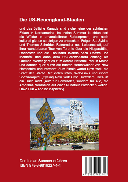 | Schlagworte | Indian Summer • USA Kanada New York • USA, Neuenglandstaaten, Radreise, Toronto, Rochester, Niagarafälle, Ottawa, Montréal, Québec, Acadia National Park, Maine, New Hamphire, Vermont, Cycling New York City |