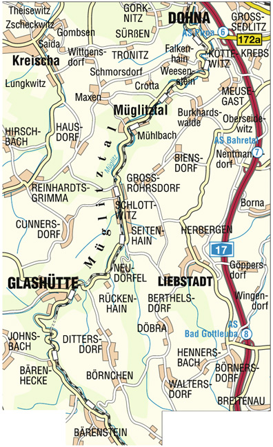 Umfasst das Gebiet des Müglitztals, des Seidewitztals und des Trebnitzgrundes mit den Ortschaften Kreischa, Dohna, Weesenstein, Reinhardtsgrimma, Schlottwitz, Liebstadt, Glashütte und Bärenstein.