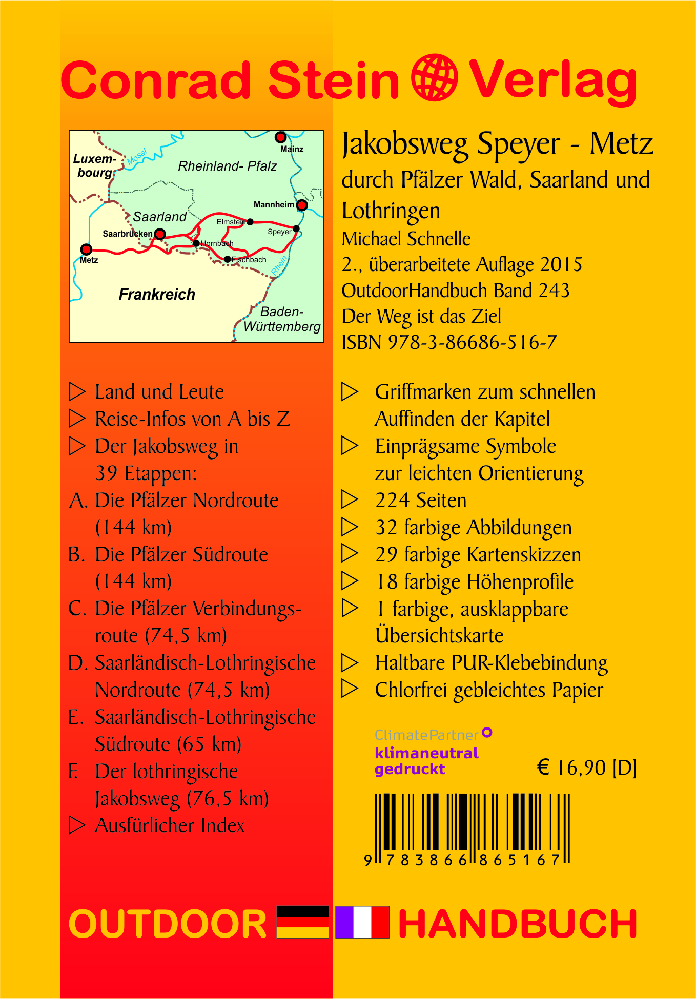 | Schlagworte | Jakobsweg • Jakobsweg / Jakobusweg; Wanderführer • Jakobsweg Speyer - Metz • Jakobsweg; Wanderführer • Lothringen, Lorraine • Lothringen; Wanderführer • Metz • Pfälzer Wald, Saarland und Lothringen • Pfalz; Wanderführer • Pilgern • pilgern in Deutschland • Radpilger • Reiseführer • Reiseführer: Abenteuerurlaub • Saarland • Saarland; Wanderführer • Speyer • Walking, Wandern, Trekking |