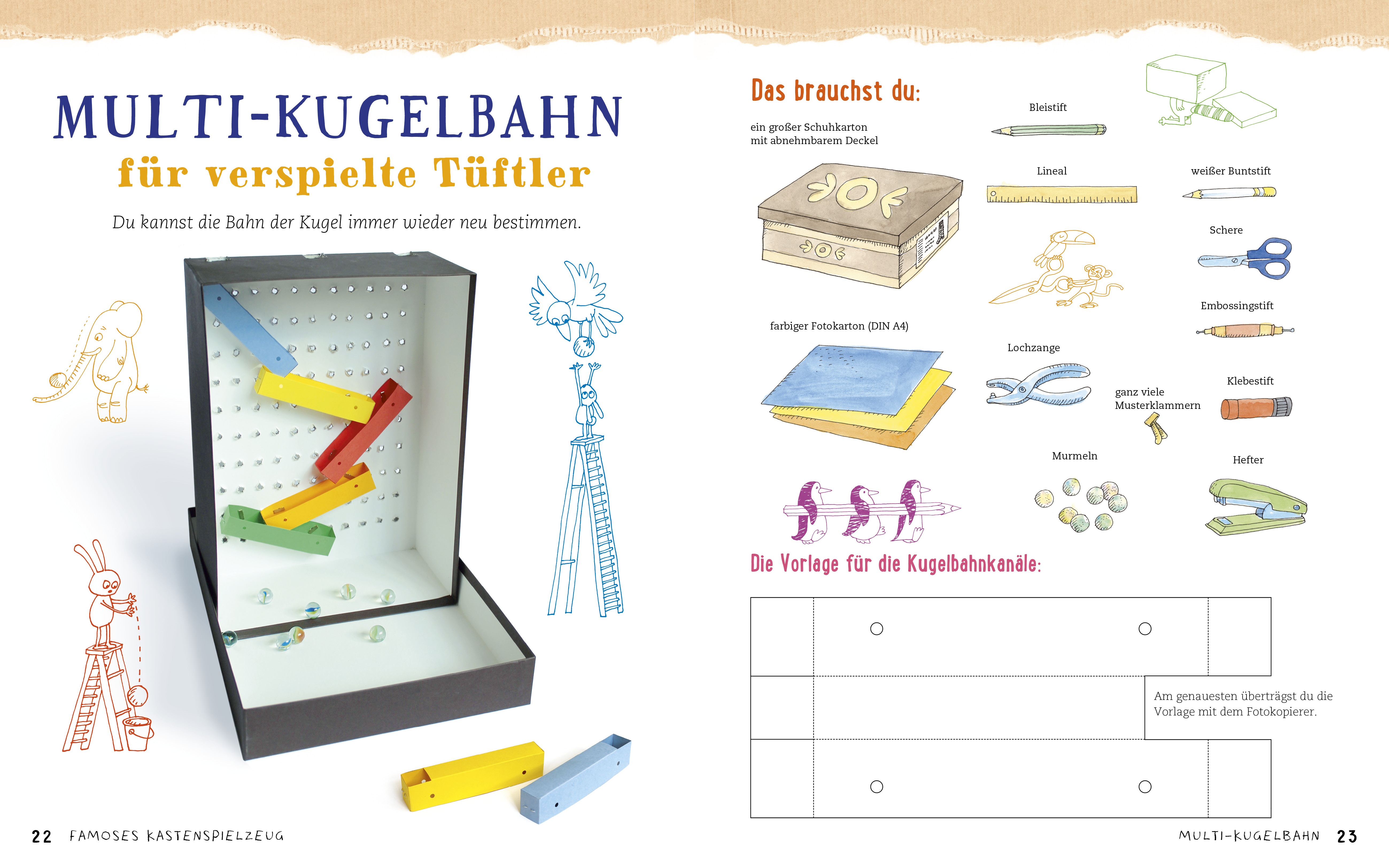 | Schlagworte | Alltagsmaterialien • Basteln • Basteln; Kindersachbuch/Jugendsachbuch • Box • Karton; Kindersachbuch/Jugendsachbuch • Kinder • Kinderbeschäftigung • Kiste • Kugelbahn • Lifestyle, Hobbys und Freizeit • Recycling • Ritterburg • Schuhkarton • Spielen • Tischfußball |