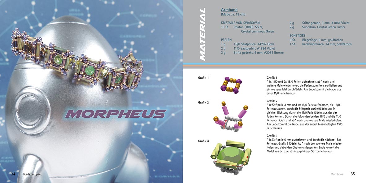 Der Weltraum, undendliche Möglichkeiten für Schmuckstücke jeder Art - Armbänder, Ketten, Anhänger und Ohrhänger. Jedes kinderleicht nachzuarbeiten, dank der bebilderten Anleitungen und genauen Materialangaben zu jedem Stück. Machen Sie sich auf die Reise ins Universum und entdecken Sie die Halskette Galatea mit ihren farbenfrohen O-Beads oder das Armband Morpheus, dessen Chatons mit den Sternen um die Wette glitzern.Mit einem Gastbeitrag von Sabine Lippert.