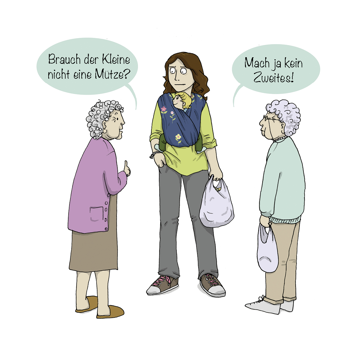 "Was bekommt man in der Schwangerschaft, außer einemdicken Bauch? Genau! Ungefragt nutzlose Ratschläge.Ist das Kindlein endlich da, dann merkt man schnell,dass man sich nicht ausreichend genug vorbereitenkann. Nach der Geburt meines Sohnes und denersten grauen Haaren beschloss ich, mich mit dem Zeichnenvon der Realität selbst zu therapieren und lernte so,mich entspannt zurückzulehnen:Wenn die Menschheit bis heute nicht ausgestorben ist,dann wird sie in diesem Haushalt nicht damit anfangen!"- Nicole Pustelny(Textildesign, Illustration)