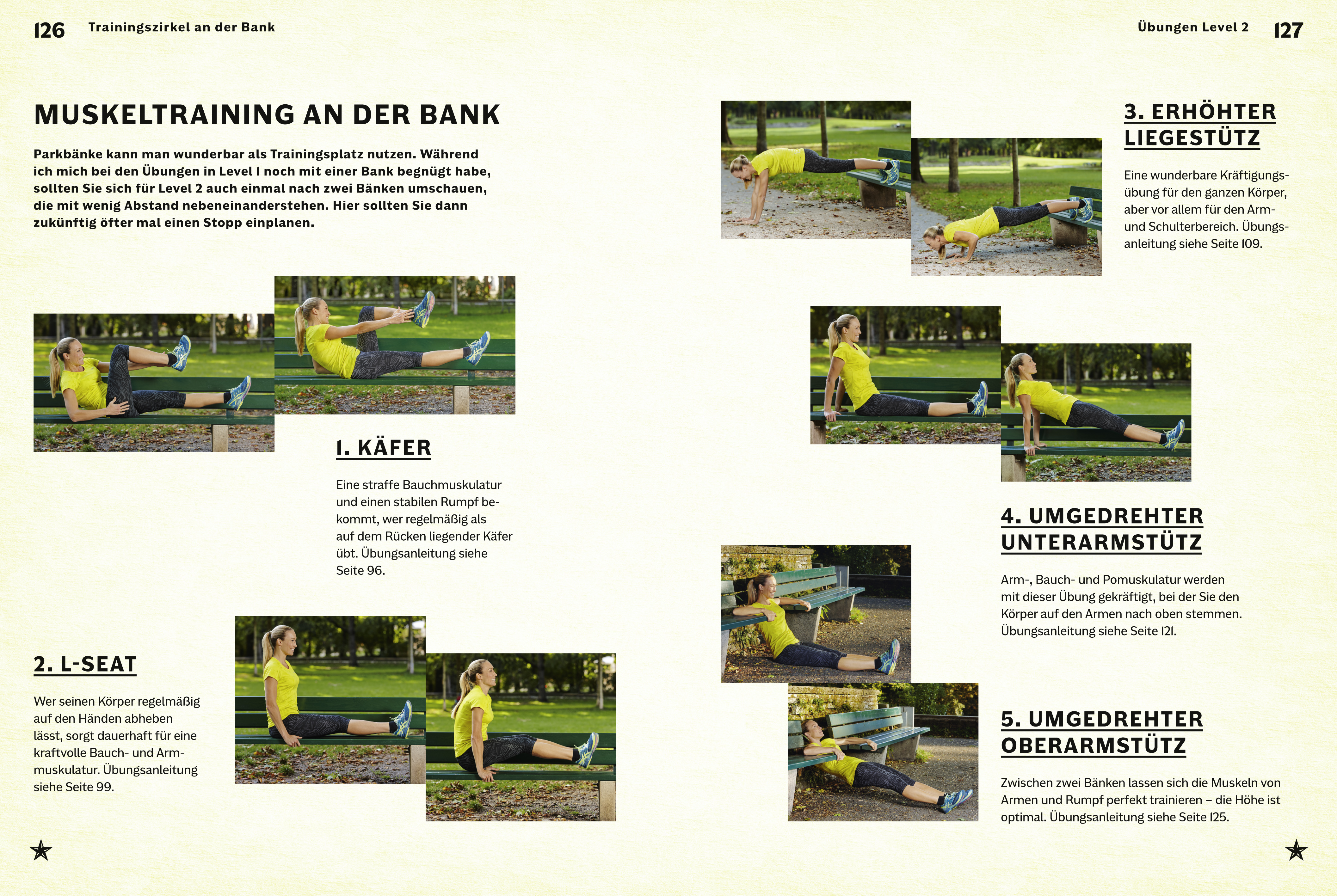 Trainingskonzept für mehr Kraft, Beweglichkeit und Ausdauer. Krafttraining im Fitnessstudio? Darauf hatte Christine Theiss nach ihrer Karriere als Profisportlerin keine Lust mehr. Deshalb hat die Kickbox-Weltmeisterin ihr Muskeltraining ins Grüne verlegt und strafft Bauch, Beine und Po nun während der täglichen Joggingrunden. Jetzt verrät die Powerfrau in diesem Fitness- und Laufbuch ihre besten Workouts. Übungszirkel für verschiedene Fitness-Level machen das Training mit dem eigenen Körpergewicht ganz einfach und können in das Joggen eingebaut werden. Das Workout funktioniert als Training ohne Geräte: Die einzigen Hilfsmittel sind Parkbänke, Treppen, Geländer, die eigenen Muskeln und Spaß an der Bewegung.