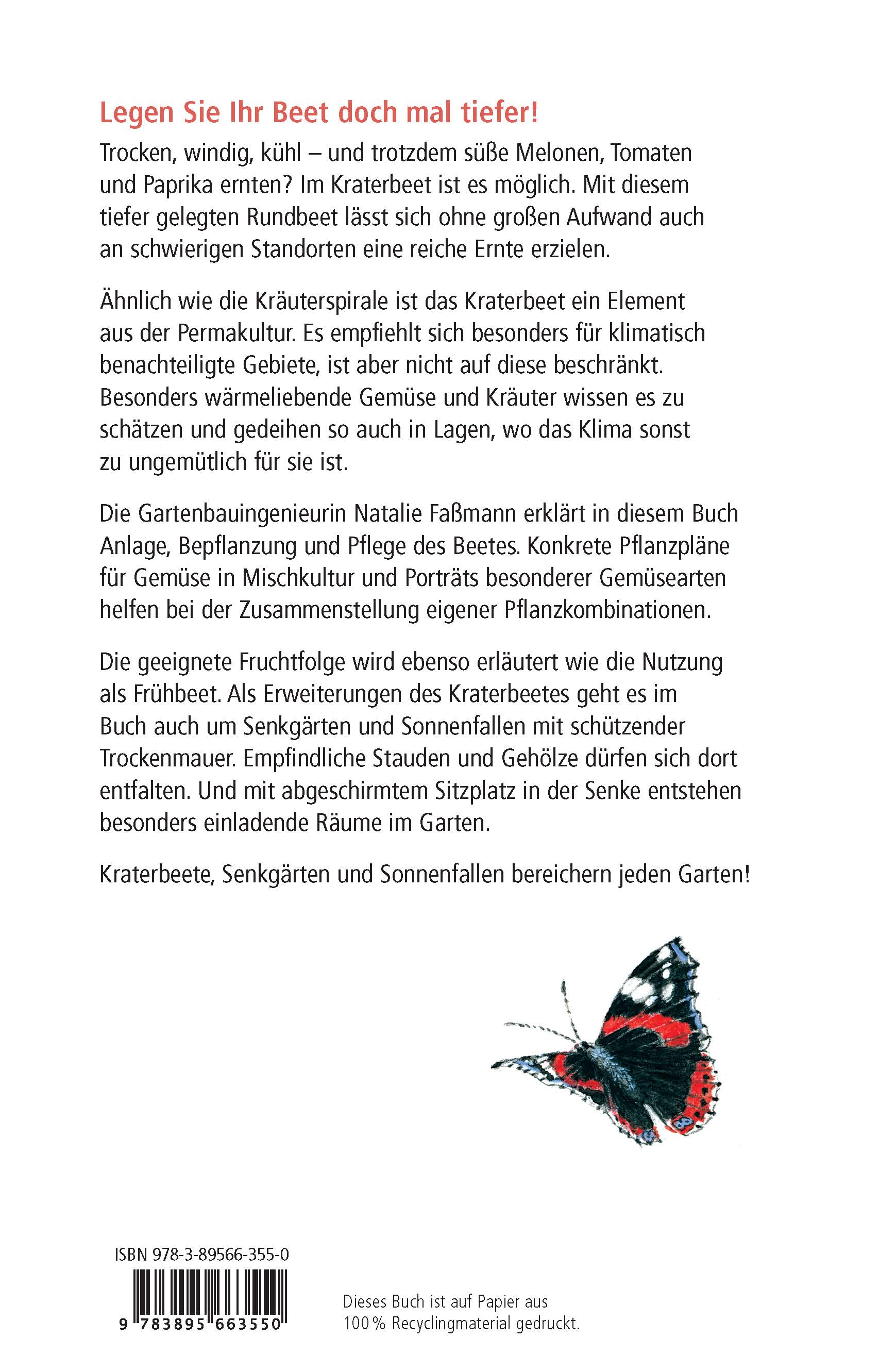 Ähnlich wie die Kräuterspirale ist das Kraterbeet ein Element aus der Permakultur. Es empfiehlt sich besonders für klimatisch benachteiligte Gebiete, ist aber nicht auf diese beschränkt. Besonders wärmeliebende Gemüse und Kräuter wissen es zu schätzen und gedeihen so auch in Lagen, wo das Klima sonst zu ungemütlich für sie ist. Natalie Faßmann erklärt in diesem Buch Anlage, Bepflanzung und Pflege des Beetes. Konkrete Pflanzpläne für Gemüse in Mischkultur und Porträts besonderer Gemüsearten helfen bei der Zusammenstellung eigener Pflanzkombinationen.