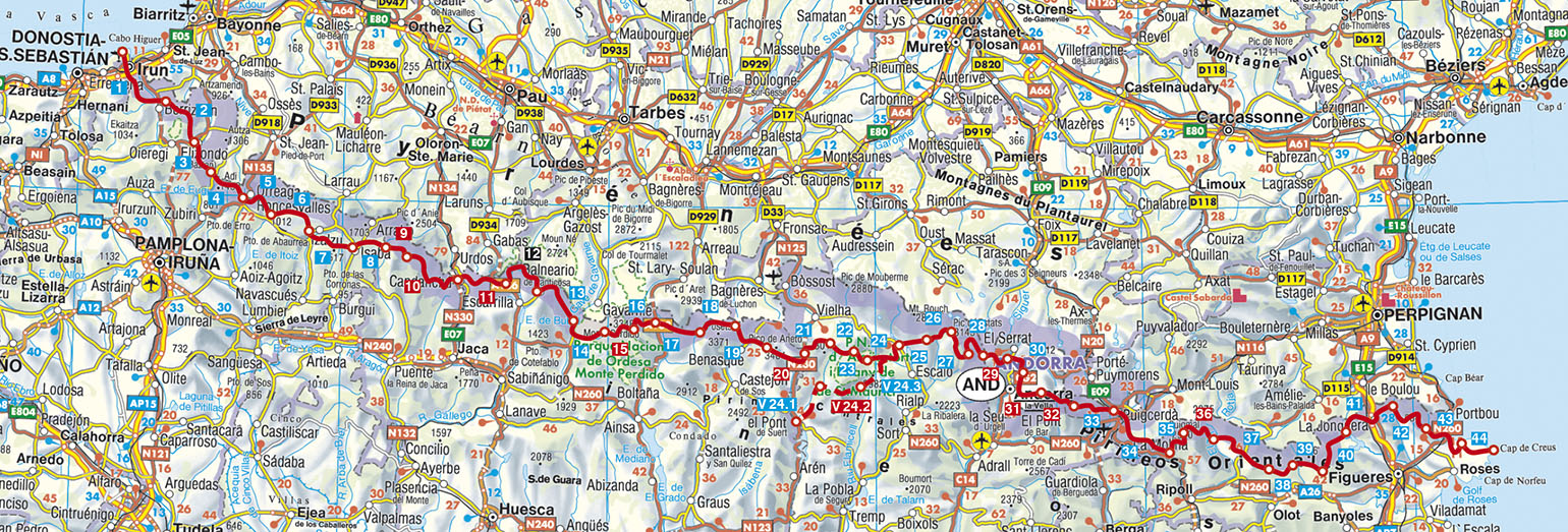 Über fast 830 Kilometer führt der GR 11, die »Transpirenaica«, von der Atlantikküste bis zum Mittelmeer. Der Weg der eher anspruchsvollen Weitwanderung wechselt zwischen einsamen Gebirgspfaden, eindrucksvollen Überresten der Geschichte und kulturellen Highlights: Hünengräber, romanische Kapellen, mittelalterliche Burgen und Bunkeranlagen aus dem Spanischen Bürgerkrieg erzählen von den bewegten Zeiten der Grenzregion. Gipfelstürmer haben die Möglichkeit, zahlreiche Gipfel zu erklimmen, wie den berühmten Monte Perdido, den »König der Kalkgipfel«.