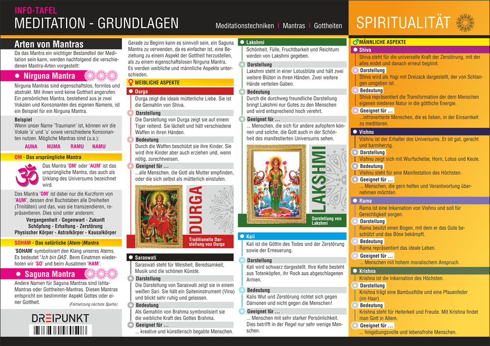 | Schlagworte | Anfänger • Anleitung • Dreipunkt • Dreipunkt-Verlag • Einsteiger • Gottheiten • Info-Tafel • InfoTafel • Körper und Geist: Meditation und Visualisierung • Mantra • Meditation • Meditation; Nonbooks • meditieren • Techniken • Yoga |