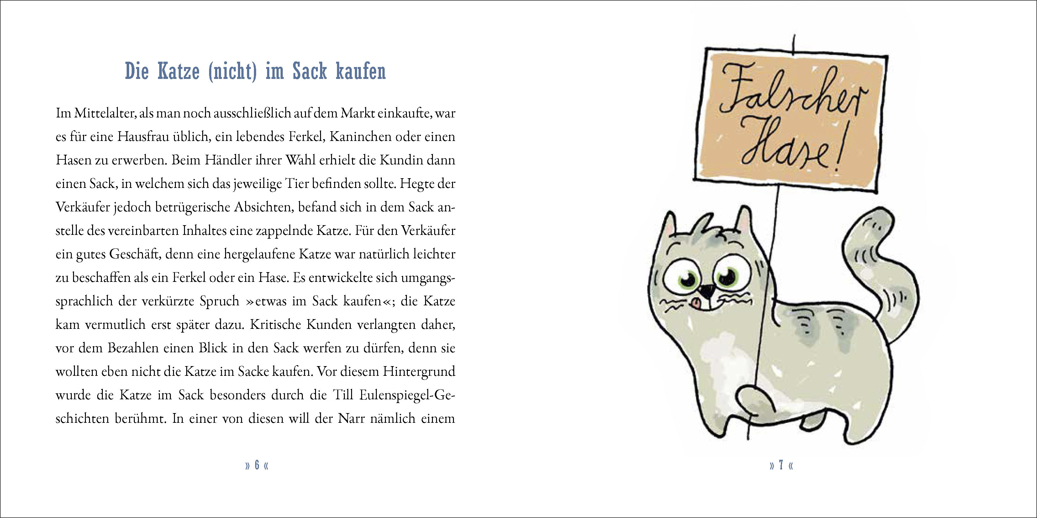 Hüte dich vor Katzen, die vorn lecken und hinten kratzen. Wer kennt sie nicht, Alltagssprüche wie Bei Nacht sind alle Katzen grau oder Ich kaufe doch nicht die Katze im Sack . Aber wie kamen sie zu Stande? Letzterer geht beispielsweise auf das Markttreiben vor dreihundert Jahren zurück, als Betrüger statt des teuren Kaninchens einfach eine Katze in den Sack steckten, um gutes Geschäft zu machen. Also ließen sich erfahrene Käufer schon bald den Sack öffnen und so war dann oftmals die Katze aus dem Sack und damit ein nächstes Sprichwort geboren! Zu den interessanten wie vergnüglichen von Annette Behr zusammengetragenen Geschichten schuf Claas Janssen Farbillustrationen voller Charme und Witz.