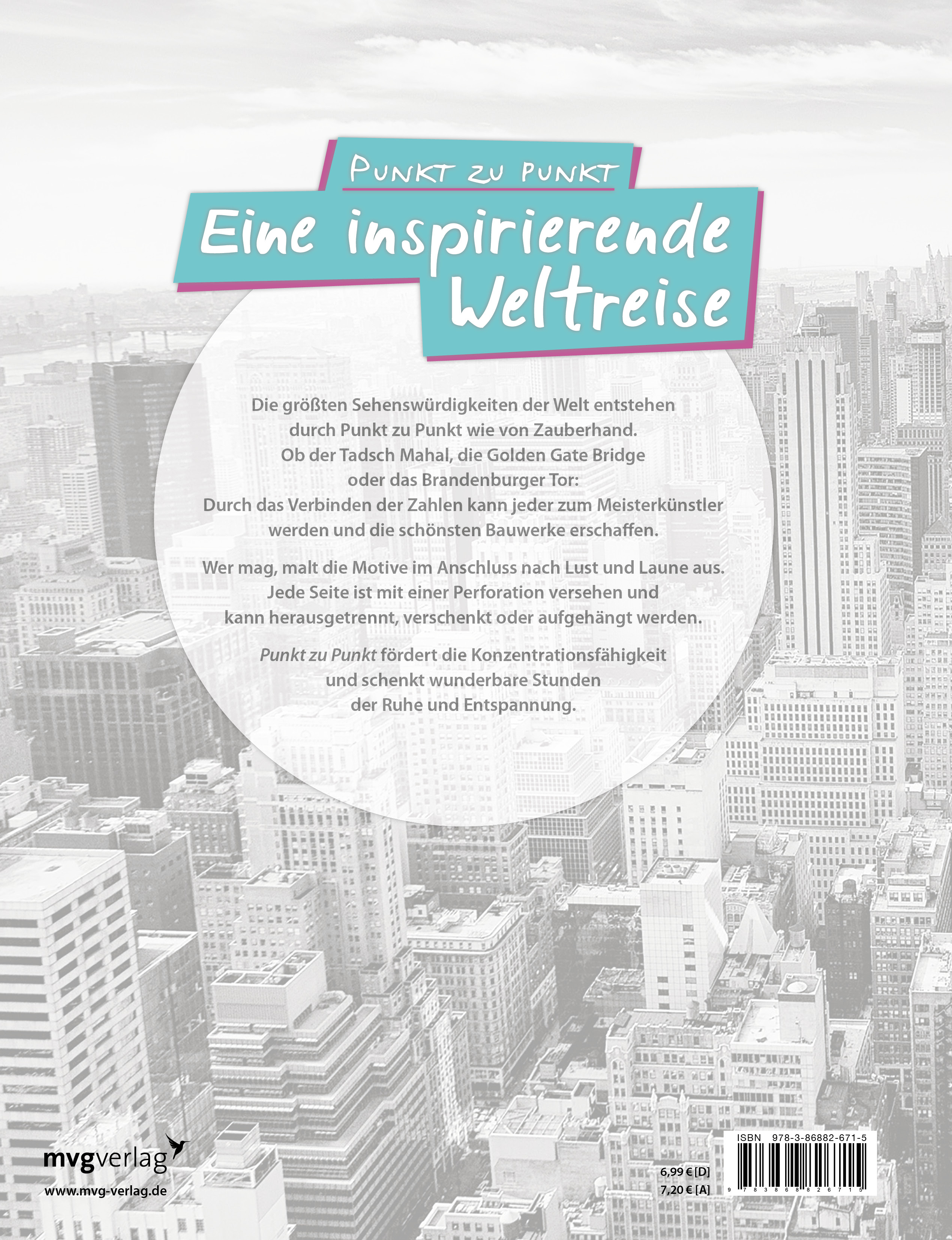 Die größten Sehenswürdigkeiten der Welt entstehen durch Punkt-zu-Punkt wie von Zauberhand. Ob der Taj Mahal, die Golden Gate Bridge oder das Brandenburger Tor: Durch das Verbinden der Zahlen kann jeder zum Meisterkünstler werden und die schönsten Bauwerke erschaffen. Wer mag, malt die Motive im Anschluss nach Lust und Laune aus. Jede Seite ist mit einer Perforation versehen und kann herausgetrennt, verschenkt oder aufgehängt werden. Punkt zu Punkt fördert die Konzentrationsfähigkeit und schenkt wunderbare Stunden der Ruhe und Entspannung.