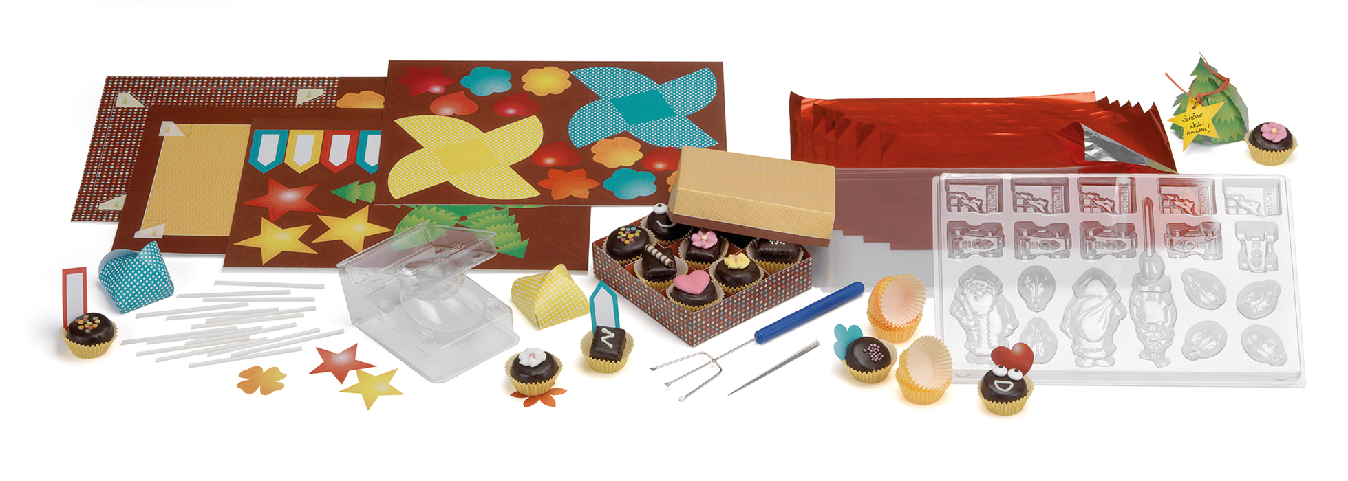 Schokolade im Wasserbad schmelzen und schon lässt sie sich in jede gewünschte Form gießen: vom Nikolaus über das Osterei bis hin zum Auto oder Schokotäfelchen. Auch Pralinen können hergestellt werden. Einfach mit der Profi-Pralinengabel z. B. ein Stück Obst, einen Keks oder eine Waffel in die flüssige Schokolade tauchen und danach mit den Modellierstäbchen, Dekostreuseln und viel Fantasie in kleine Kunstwerke verwandeln. Die mitgelieferten Bastelbogen enthalten schicke Anhänger und Schachteln, die schnell zusammengefaltet sind, so dass die selbstgemachten Pralinen zum Verschenken toll verpackt werden können.