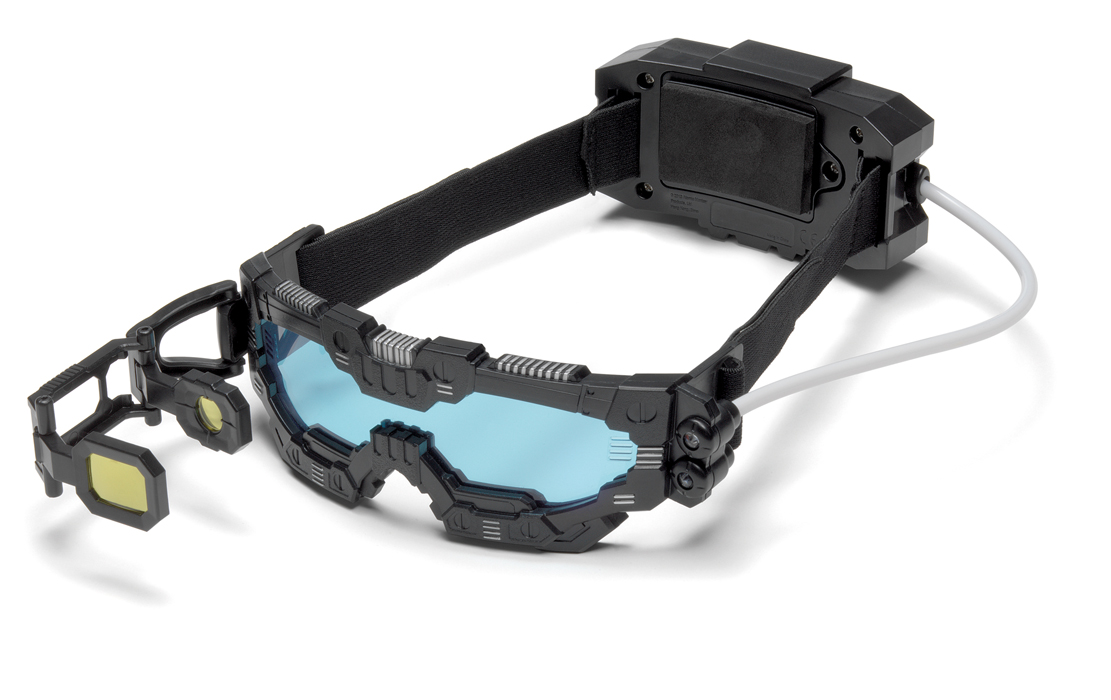 Ideal für geheime Aufklärungsmissionen – auch im Dunkeln. Eine integrierte LED beleuchtet die Umgebung. Mit dem vorklappbaren Visier mit zwei gelb gefärbten Linsen kann man Objekte oder Personen sogar in weiter Ferne fokussieren. Dank des Stirnbandes hat man die Hände frei, um Notizen zu machen oder Spuren zu suchen.