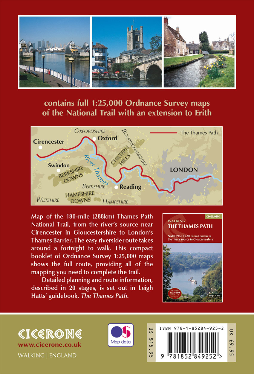 All the mapping you need to complete the 180 mile (288km) Thames Path National Trail, from London's Thames Barrier to the river's source in Gloucestershire. This booklet is included with the Cicerone guidebook to the Thames Path, where the route is divided into 20 stages, with each stage ranging from 4 to 16 miles. This gentle riverside walk takes roughly two weeks to complete.
