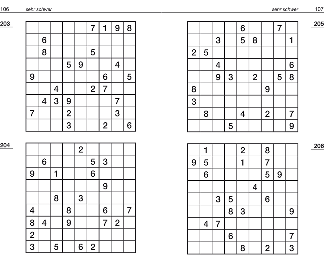 Das aus Japan kommende Rätsel Sudoku besteht aus neun quadratischen 3 x 3-Blöcken, wobei jeder quadratische Block in drei Reihen mit jeweils drei Kästchen unterteilt ist. In jedem quadratischen 3 x 3-Block sind Zahlen zwischen 1 und 9 vorgegeben. Diese vorgegebenen Zahlen gilt es so zu ergänzen, dass jede Zahl zwischen 1 und 9 nur einmal vorkommt. Auch in den neun Spalten und neun Zeilen des gesamten Sudoku-Rätsels dürfen die Zahlen von 1 bis 9 nur einmal vorkommen. Die Sudoku-Rätsel sind in die Schwierigkeitsstufen sehr leicht, leicht, mittelschwer, schwer und sehr schwer eingeteilt.