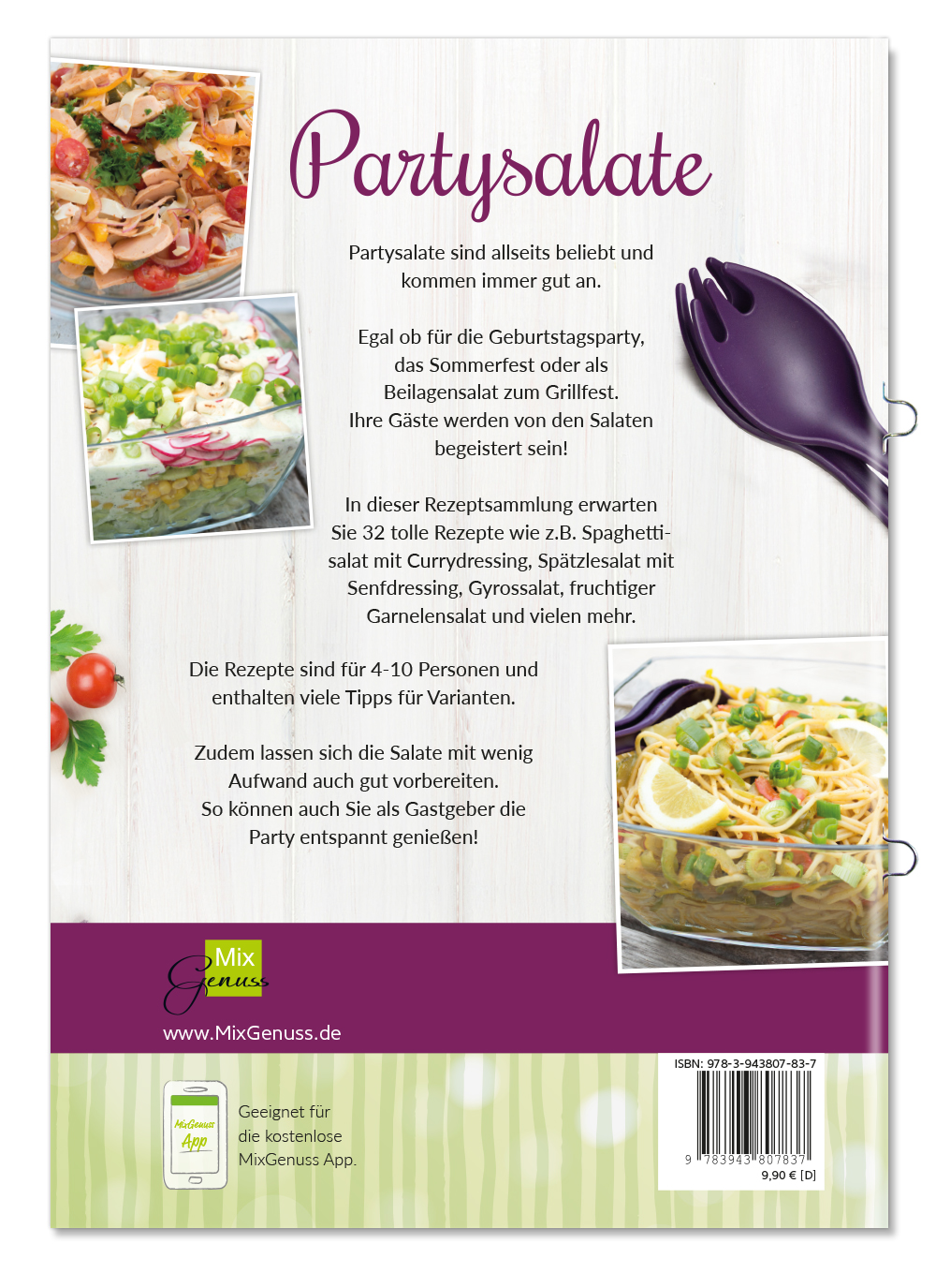 Partysalate sind allseits beliebt und kommen immer gut an.Egal ob für die Geburtstagsparty, das Sommerfest oder als Beilagensalat zum Grillfest.Ihre Gäste werden von den Salaten begeistert sein!In dieser Rezeptsammlung erwarten Sie 32 tolle Rezepte wie z.B. Spaghetti-salat mit Currydressing, Spätzlesalat mit Senfdressing, Gyrossalat,fruchtiger Garnelensalat und vielen mehr.