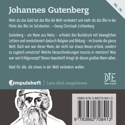 Gutenberg – ein Mann aus Mainz – erfindet den Buchdruck mit beweglichen Lettern und revolutioniert dadurch Religion und Bildung – im Grunde die ganze Welt. Doch wer war dieser Mann, der nicht nur etwas Neues erfand, sondern es zugleich umsetzte? Welche Herausforderungen musste er meistern? Was war sein Erfolgsrezept? Dieses Impulsheft bringt dir diesen großen Mann näher. Ideal für alle, die etwas in der Welt verändern wollen.