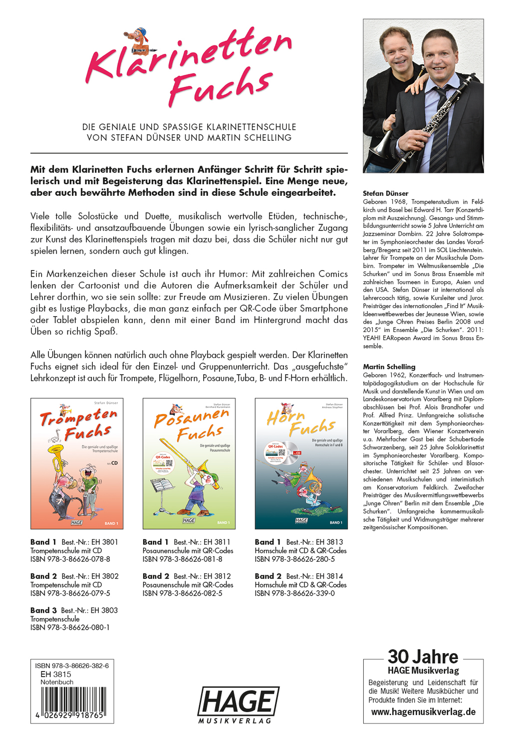 Stefan Dünser, Geboren 1968, Trompetenstudium in Feldkirch und Basel bei Edward H. Tarr (Konzertdiplom mit Auszeichnung). Gesangs- und Stimmbildungsunterricht sowie 5 Jahre Unterricht am Jazzseminar Dornbirn. 22 Jahre Solotrompeter im Symphonieorchester des Landes Vorarlberg/Bregenz seit 2011 im SOL Liechtenstein. Lehrer für Trompete an der Musikschule Dornbirn. Trompeter im Weltmusikensemble „Die Schurken“ und im Sonus Brass Ensemble mit zahlreichen Tourneen in Europa, Asien und den USA. Stefan Dünser ist international als Lehrercoach tätig, sowie Kursleiter und Juror. Preisträger des internationalen „Find It“ Musik-Ideenwettbewerbes der Jeunesse Wien, sowie des „Junge Ohren Preises Berlin 2008 und 2015“ im Ensemble „Die Schurken“. 2011: YEAH! EARopean Award im Sonus Brass Ensemble. Martin Schelling, Geboren 1962, Konzertfach- und Instrumentalpädagogikstudium an der Hochschule für Musik und darstellende Kunst in Wien und am Landeskonservatorium Vorarlberg mit Diplomabschlüssen bei Prof. Alois Brandhofer und Prof. Alfred Prinz. Umfangreiche solistische Konzerttätigkeit mit dem Symphonieorchester Vorarlberg, dem Wiener Konzertverein u.a. Mehrfacher Gast bei der Schubertiade Schwarzenberg, seit 25 Jahre Soloklarinettist im Symphonieorchester Vorarlberg. Kompositorische Tätigkeit für Schüler- und Blasorchester. Unterrichtet seit 25 Jahren an verschiedenen Musikschulen und interimistisch am Konservatorium Feldkirch. Zweifacher Preisträger des Musikvermittlungswettbewerbs „Junge Ohren“ Berlin mit dem Ensemble „Die Schurken“. Umfangreiche kammermusikalische Tätigkeit und Widmungsträger mehrerer zeitgenössischer Kompositionen.