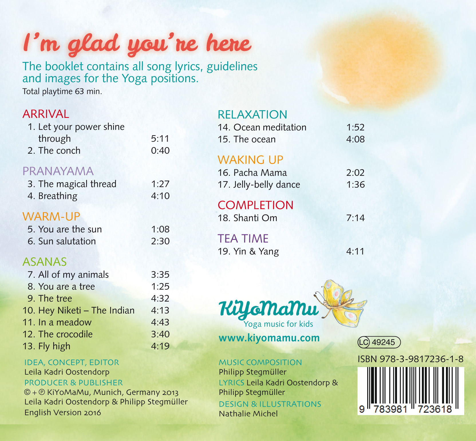 Die erste Kinderyoga-Übungs-CD im deutschprachigen Raum: Das Hörbuch "Schön dass du da bist", erschienen im KiYoMaMu Verlag, vereint musikalisch untermalte und gesungene Anleitungen und gesprochene Meditationen zu einer 1-stündigen Hatha-Yoga Sequenz für die ganze Familie! Jede Yogaposition wird in dem beiliegenden 40-seitigem Booklet zusätzlich erklärt. Laufzeit insgesamt 63 Minuten.