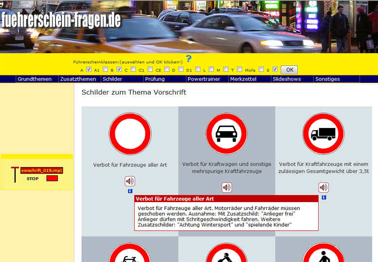 Zu allen Fragen und Verkehrszeichen gibt es selbstablaufende Slideshows mit Sprecherton