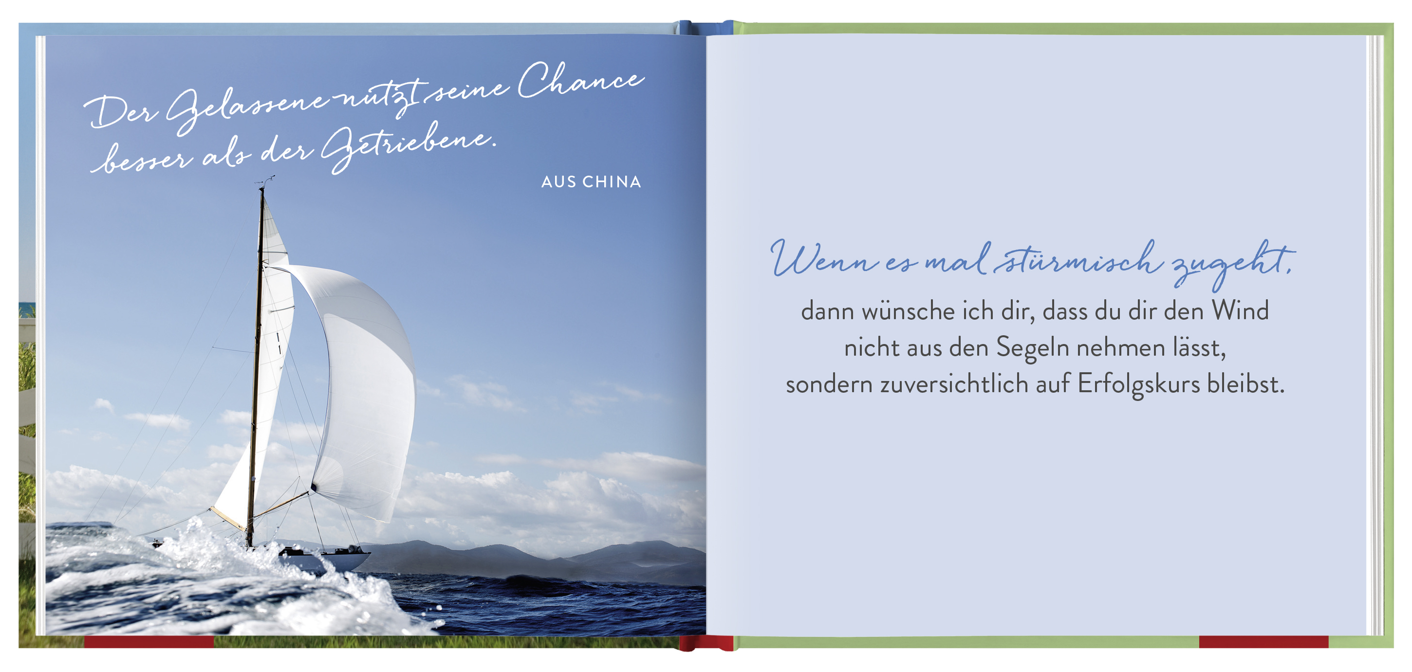 Der Beginn eines neuen Lebensabschnitts, das Abitur oder der erfolgreiche Studienabschluss, ein Umzug in die erste eigene Wohnung oder in eine fremde Stadt: im Leben junger Menschen gibt es zahlreiche Umbruchsituationen, die oftmals ein wenig Mut erfordern. Besonders in solchen Zeiten möchte man seinen Lieben zeigen, dass man an ihrer Seite ist. Mit diesem Büchlein überbringen Sie ihre Wünsche für den weiteren Lebensweg auf besonders charmante Weise. Die liebevoll formulierten Wünsche begleiten den Beschenkten bei all seinen Vorhaben: "Wenn es mal stürmisch zugeht, dann wünsche ich dir, dass du dir den Wind nicht aus den Segeln nehmen lässt, sondern zuversichtlich auf Erfolgskurs bleibst."