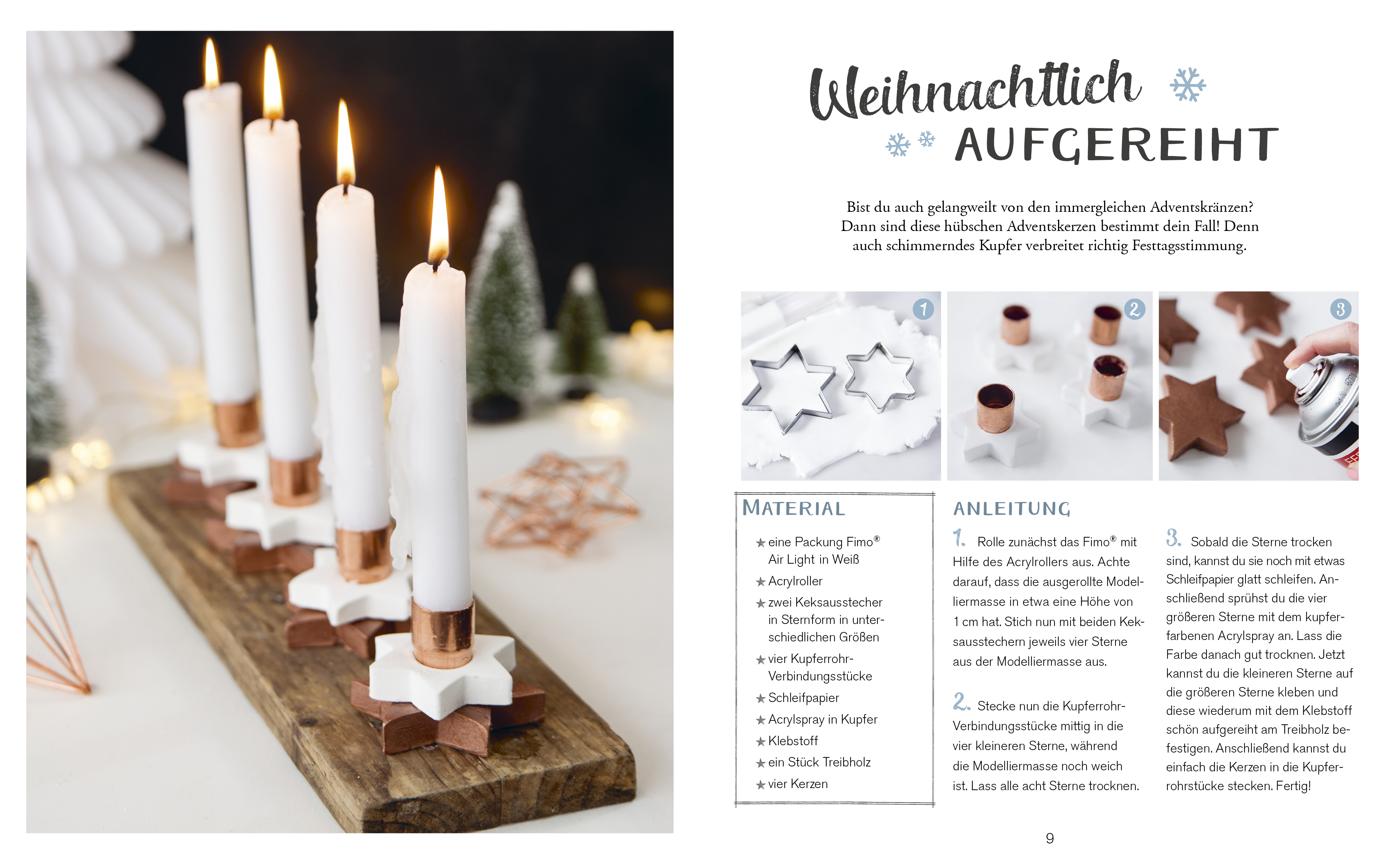 Mit diesem Buch modellieren Sie Weihnachtsdeko ganz einfach selbst: Moderne Wanddekoration, hübsche Geschenkanhänger oder festlicher Baumschmuck - Fimo® ist vielseitig und perfekt geeignet für DIY-Fans. Ob zum Dekorieren, Verschenken oder Herzeigen, die Projekte in "Weihnachtliches aus Fimo®" sorgen für eine kreative Adventszeit. Der informative Grundlagenteil zeigt den Umgang mit Fimo® und die bebilderten Schritt-für-Schritt-Anleitungen sorgen für sicheres Gelingen. Mit praktischen Vorlagen zum Sofort-Loslegen: So kann Weihnachten kommen!